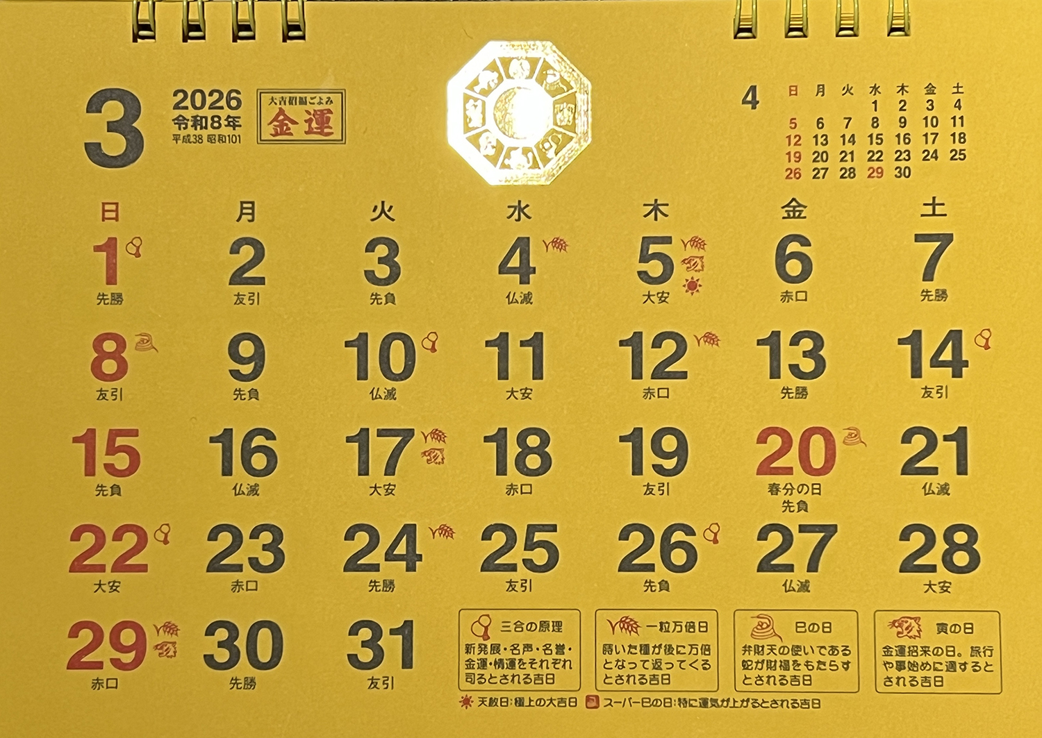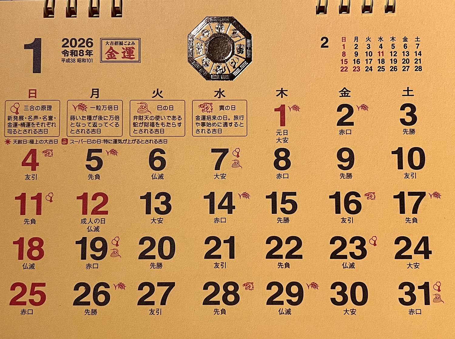2026年1月の暦。吉日ってまじでたくさんあるんですよ!