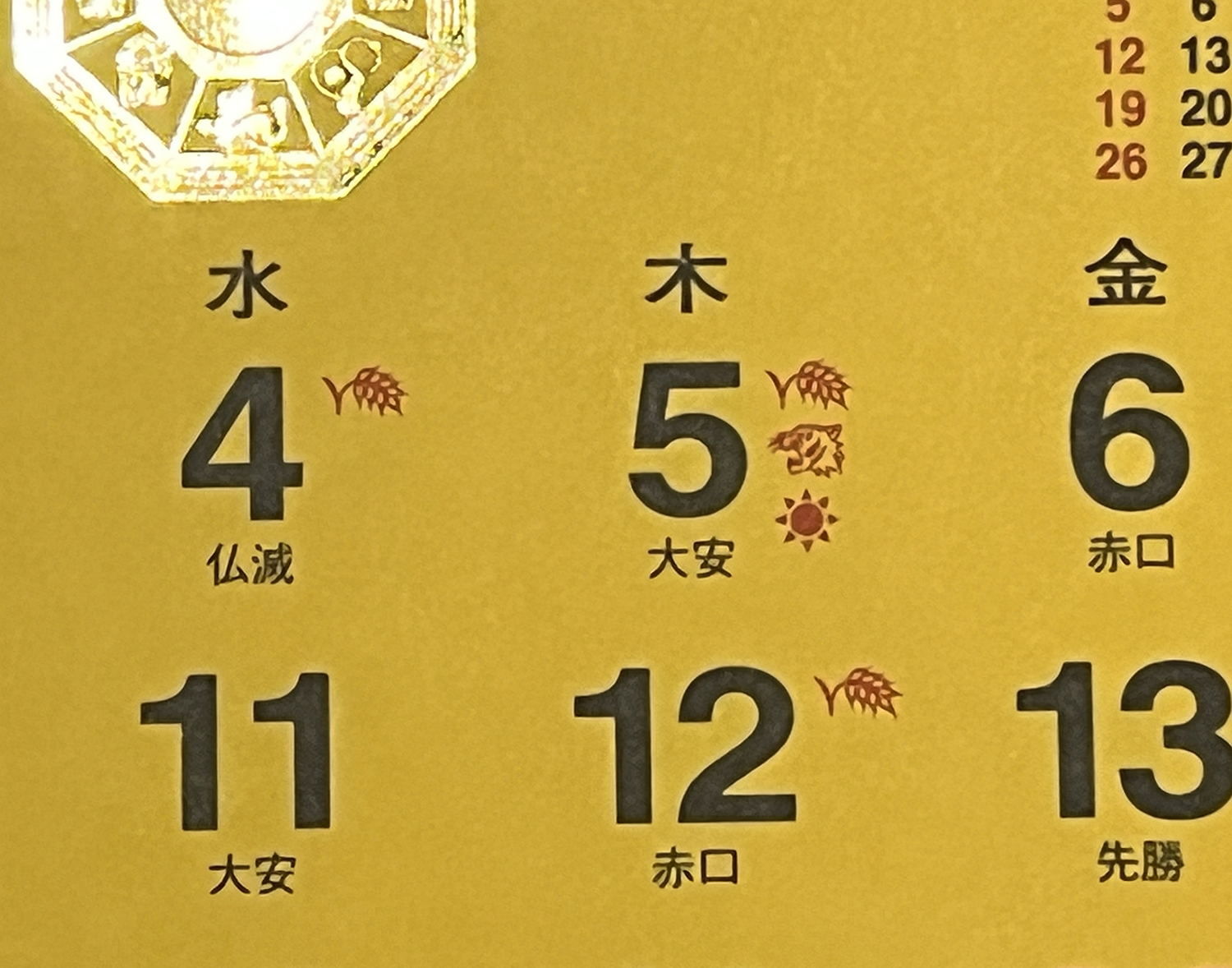 寅の日(とらのひ):金運招来の日。財布の新調や、買い物、旅行や事始めに良いとされています。「出て行ったお金がすぐに戻ってくる」という縁起の良い日とされ、住宅ローン契約や車の購入など、まとまったお金が動く高額な買い物や借金の契約にも良い日。