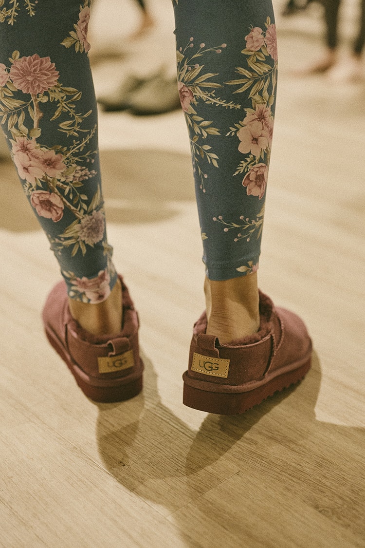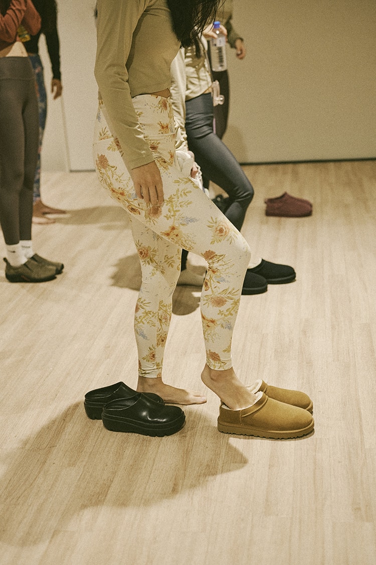 レッスン終了後はみんなで〈UGG®〉の新作スリッポンを体験。これからの季節に大活躍なふわふわインソールに夢中!