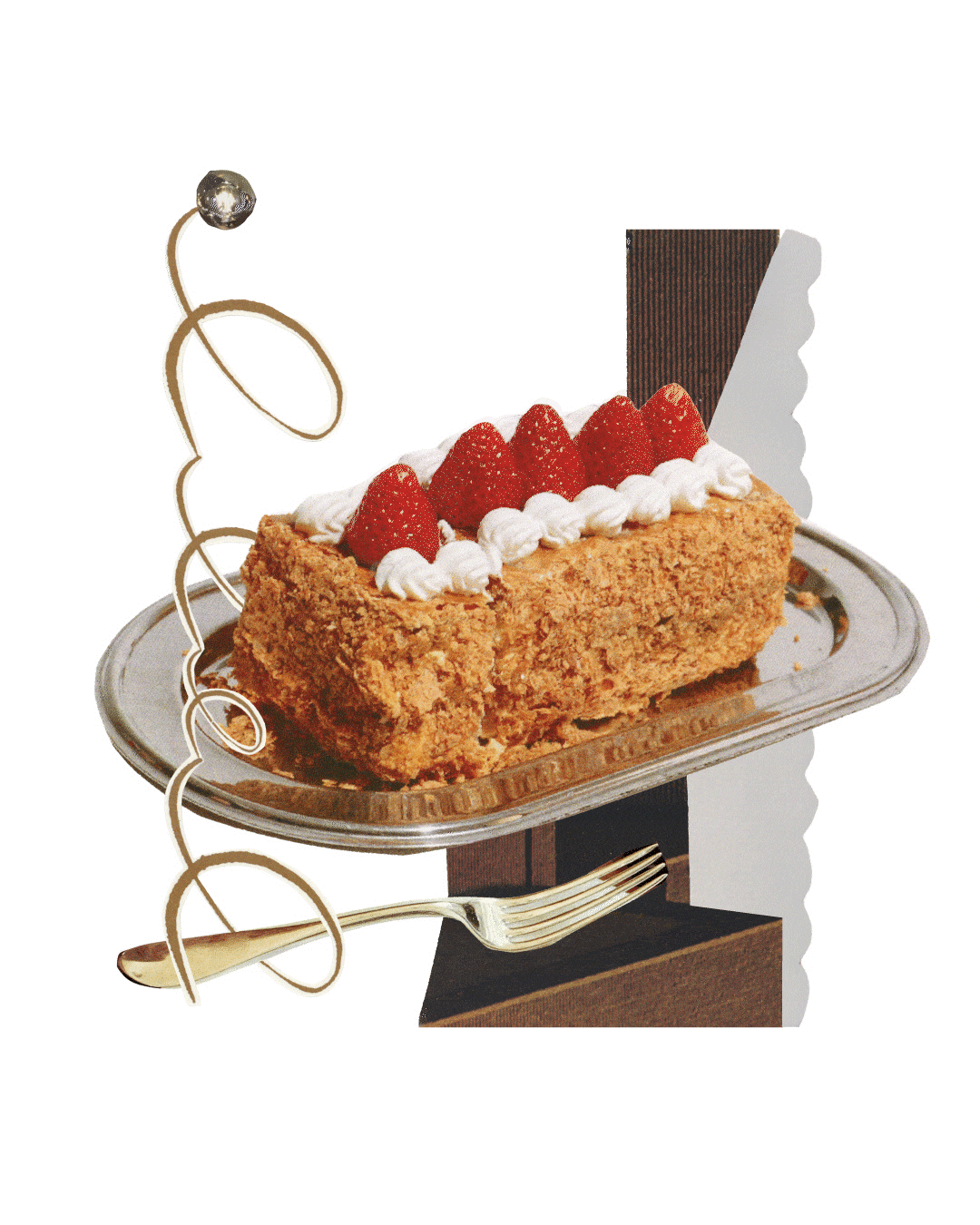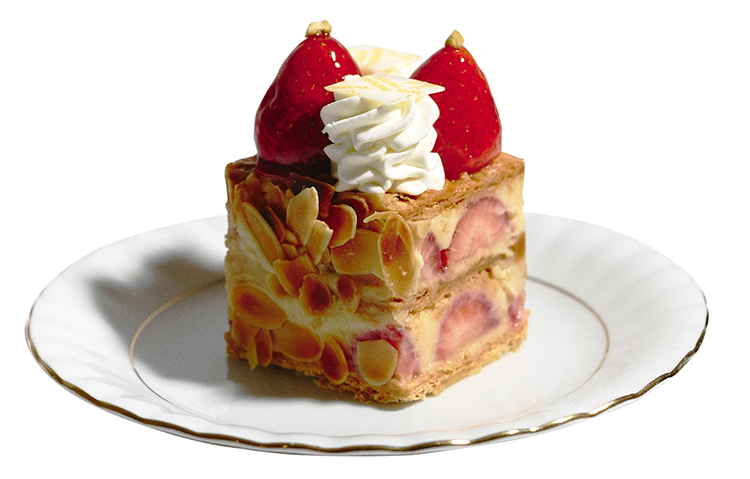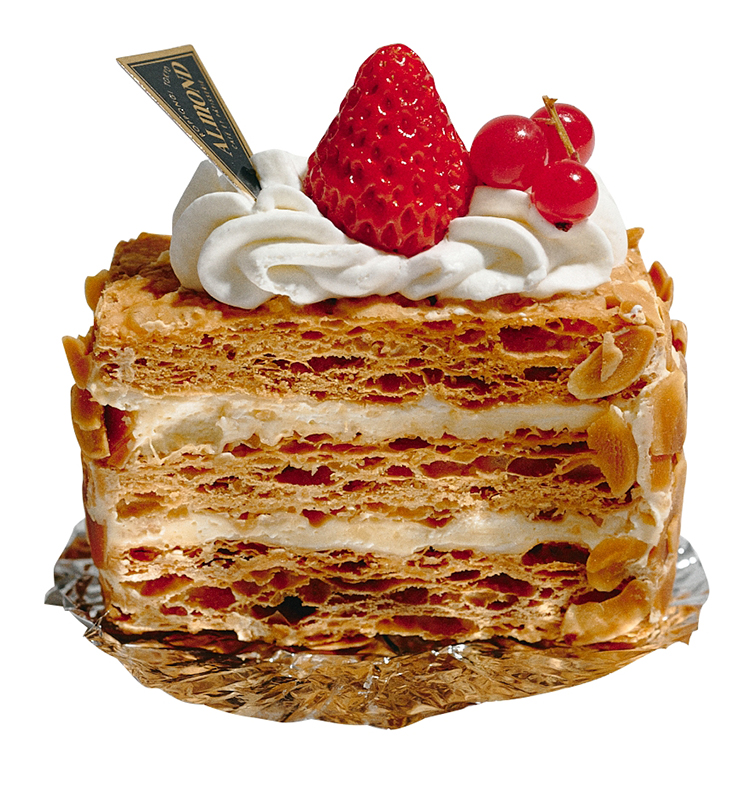 生クリームを両脇に従えたツヤツヤないちごがトップに並ぶ、名店「銀座マキシム」で愛された〝苺のミルフィーユ〟。ふわりと香るのは最高品質のオレンジリキュール、コアントロー。
