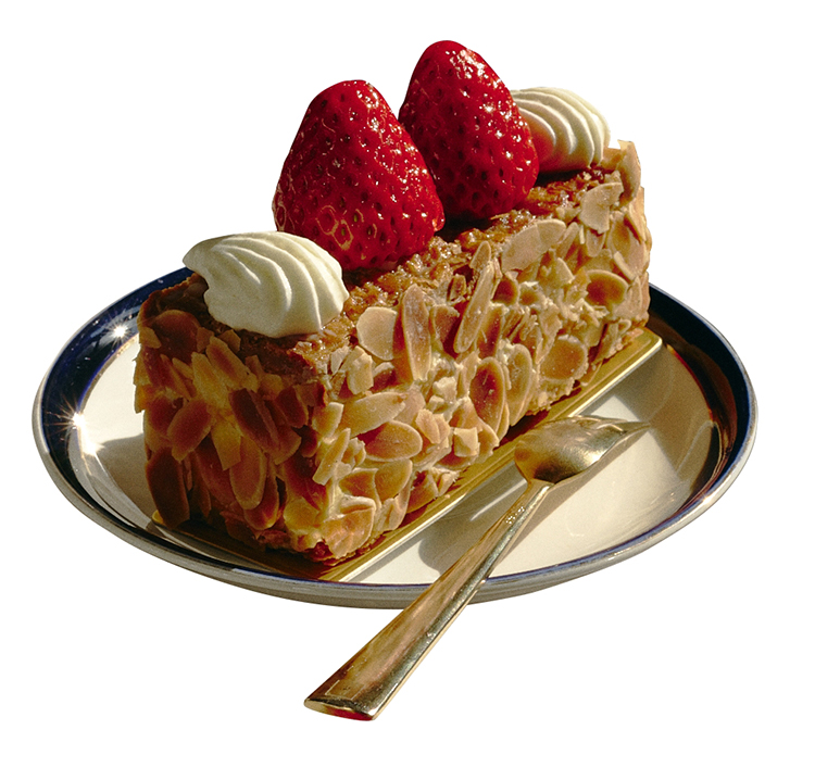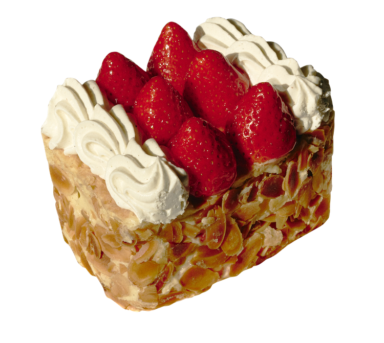 ローストアーモンドスライスで四方を囲まれたパイ生地に、均整のとれたいちごとクリーム。崩しては口に運ぶ、贅沢。