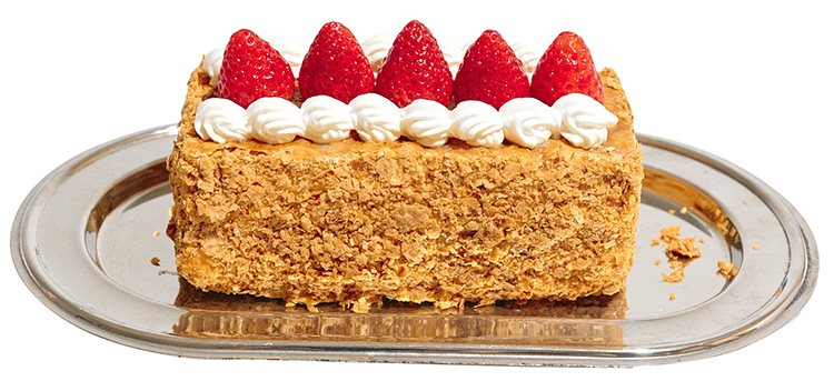 創業80年の老舗洋菓子喫茶がつくるナポレオンパイ。さっくり軽やかなパイ生地多め、ひと粒のいちごをもったいぶりながら食べたい。