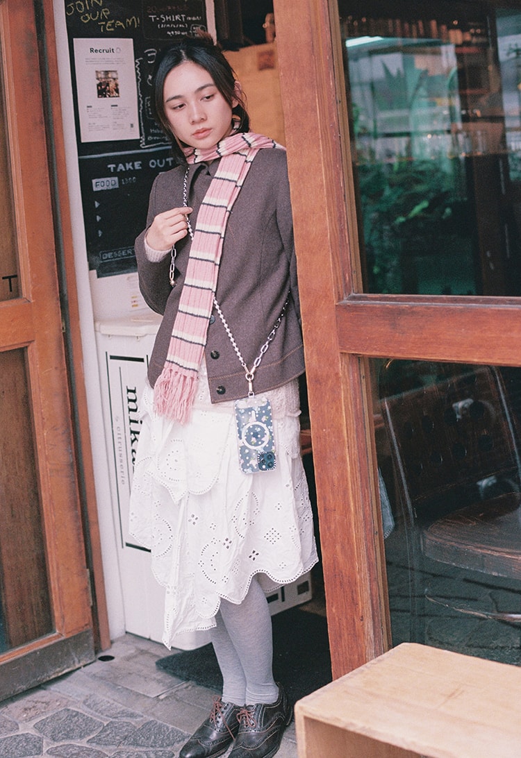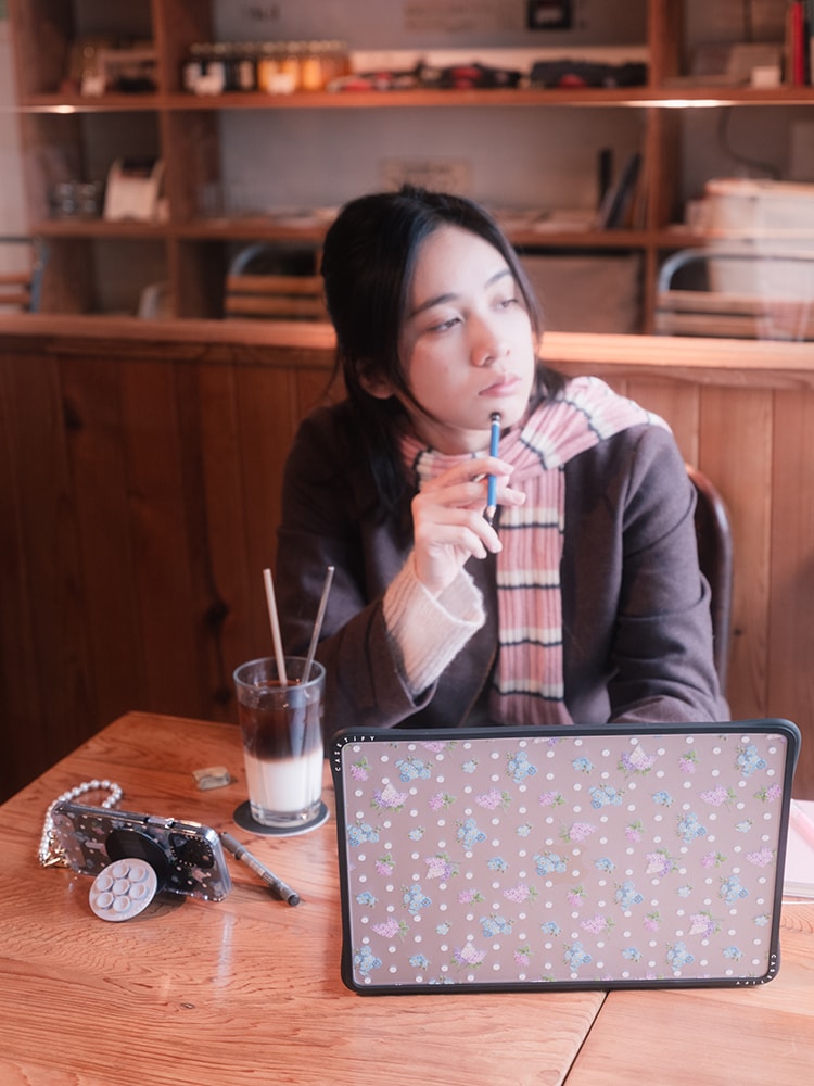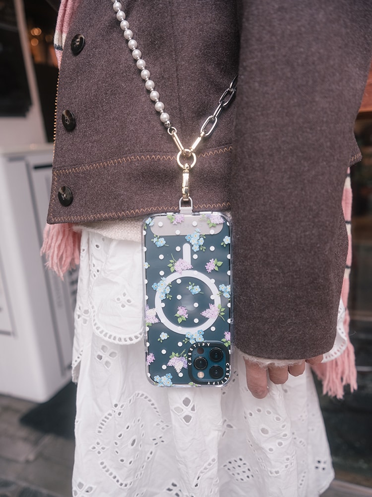 - 初春の空気感を意識して、レースのスカートやピンクのストライプニットを重ねて柔らかさを出しました。ケースは、一目で気に入った「Blue Garden Dots」のクリアタイプ。iPhone本体の色を活かしながら、服をレイヤードするように楽しめるのが魅力です。PCケースもお揃いの柄で揃えたら、デスクの上が一気に春らしくなってモチベーションが上がりました。