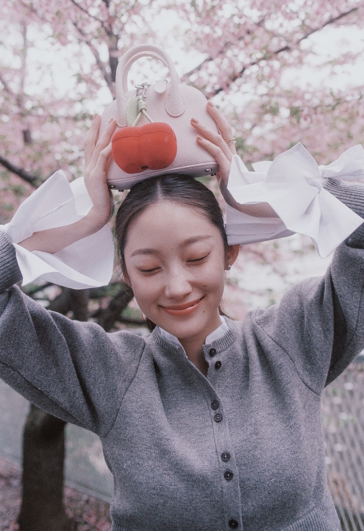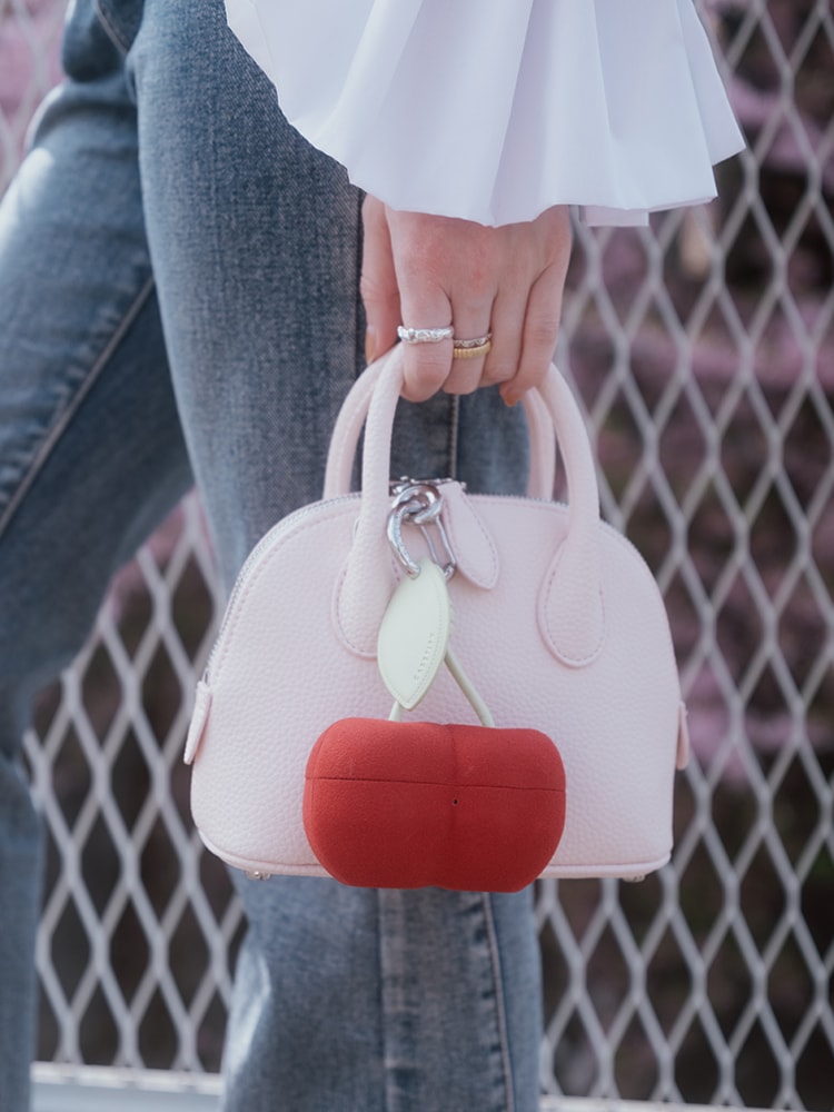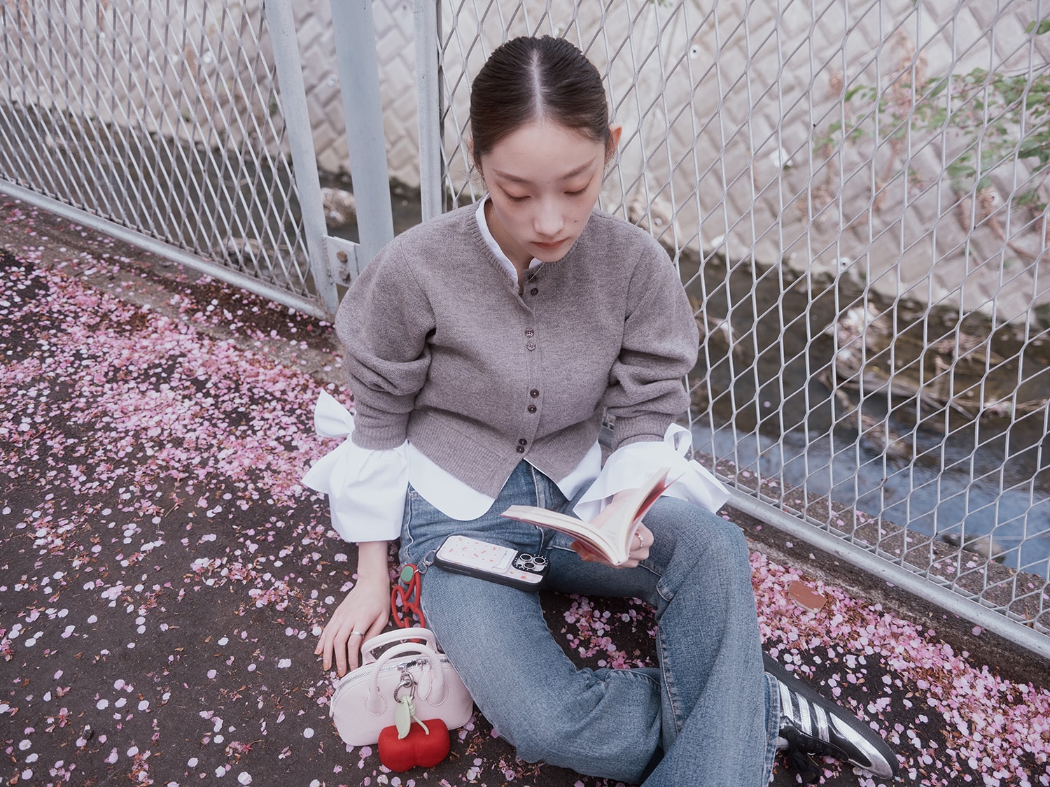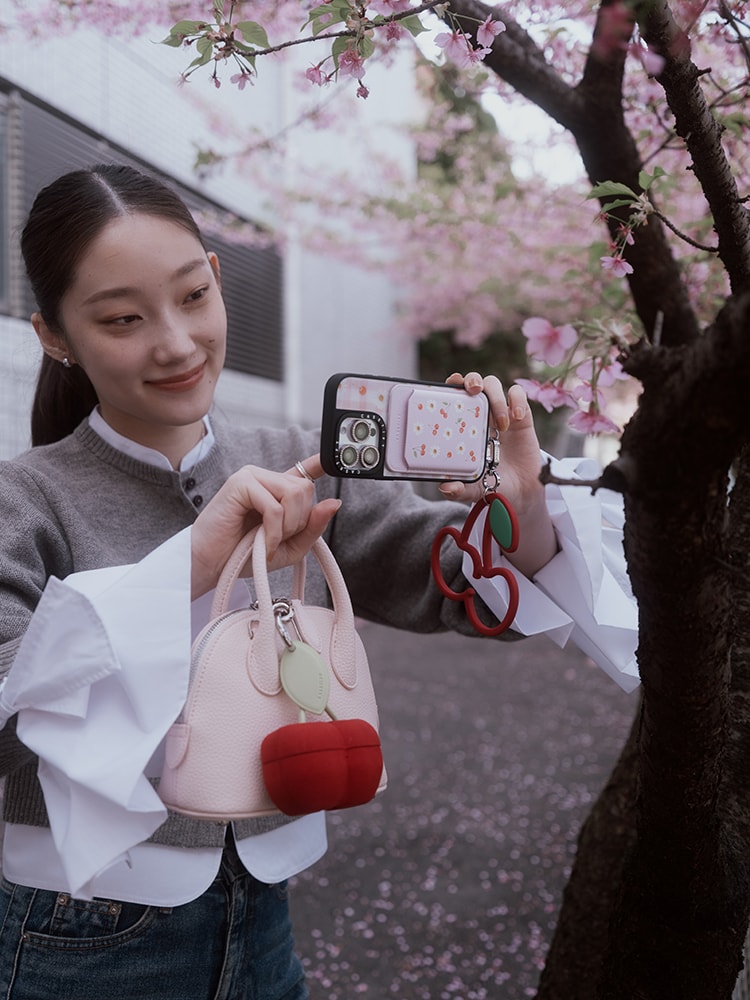 - とにかく「さくらんぼ」に一目惚れ。ケースが主役なので、カフがアクセントの白シャツにグレージュのニットカーディガンというシンプルな装いに合わせました。バッグにはおそろいのさくらんぼAirPodsケースもつけて、統一感をプラス。手に取るたび「よし!」って気分が上がる、まるでポジティブなエネルギーをそのまま持ち歩いているような感覚です。