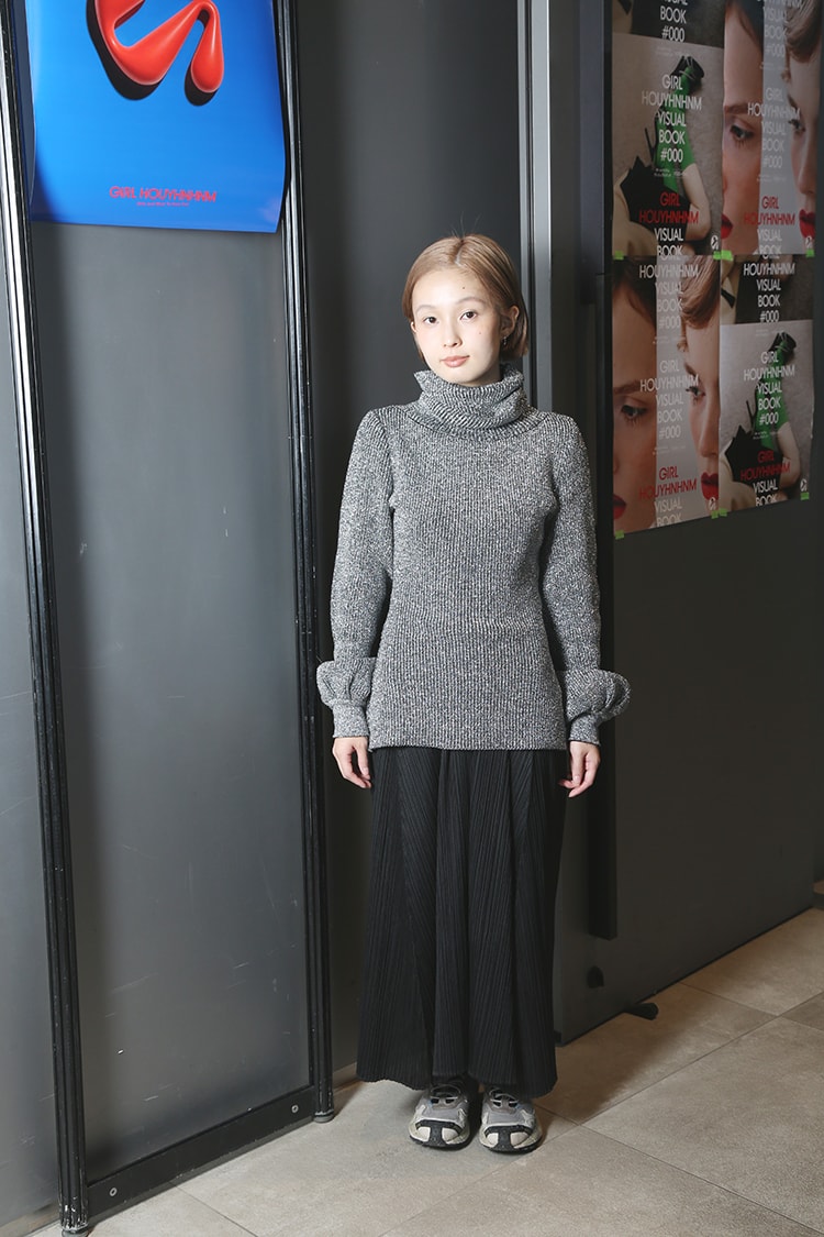 「スクールカジュアルな感じに! ニットはすごく前にゲットした、お気に入りのFifiのニット。ガーリーな感じなので他のアイテムはメンズっぽく合わせてみました(佐藤さき)」