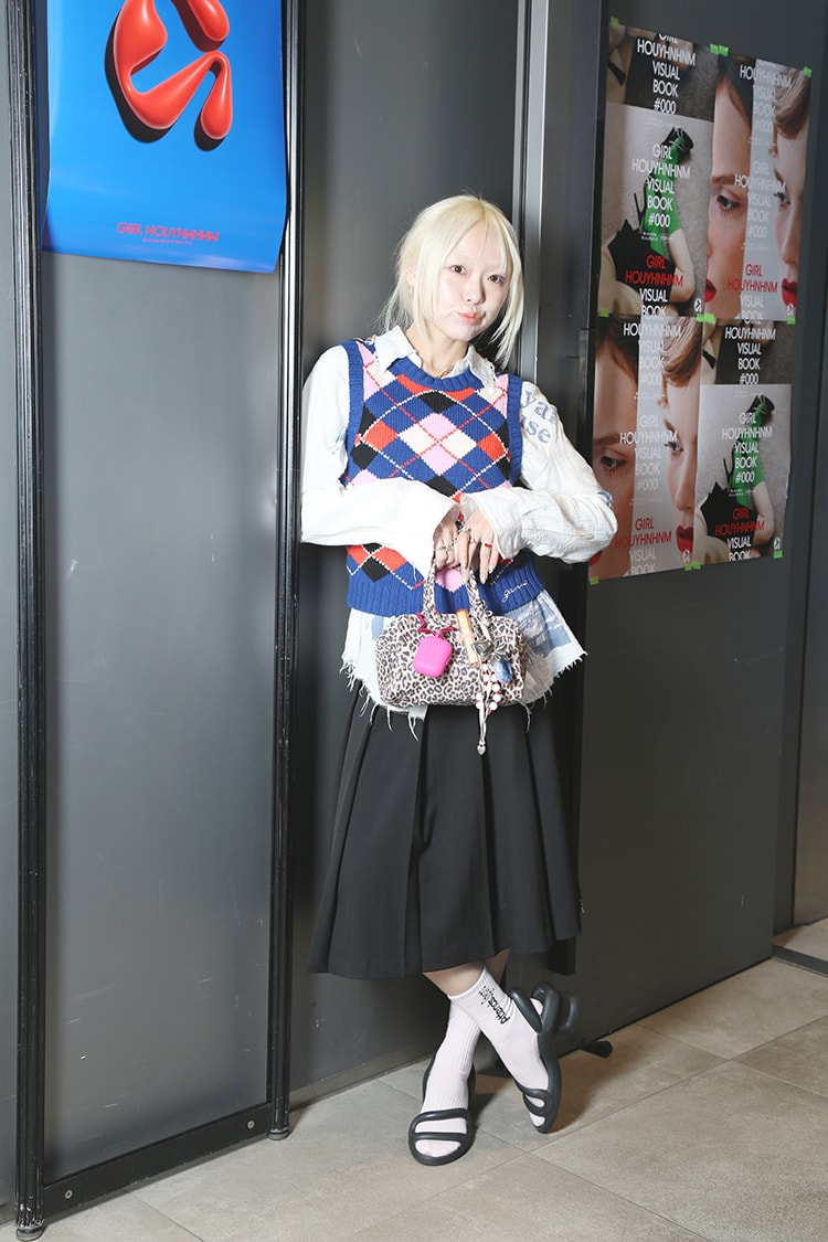 「テーマはレディなスクールガール。シャツにベストの組み合わせって学生の時の制服でしていた着こなしですが、当時はできなかったカラーリングと足元のヒール合わせがポイントです。ゆりやんがみんなを巻き込みながらライブしてくれてずっと笑ってました!」