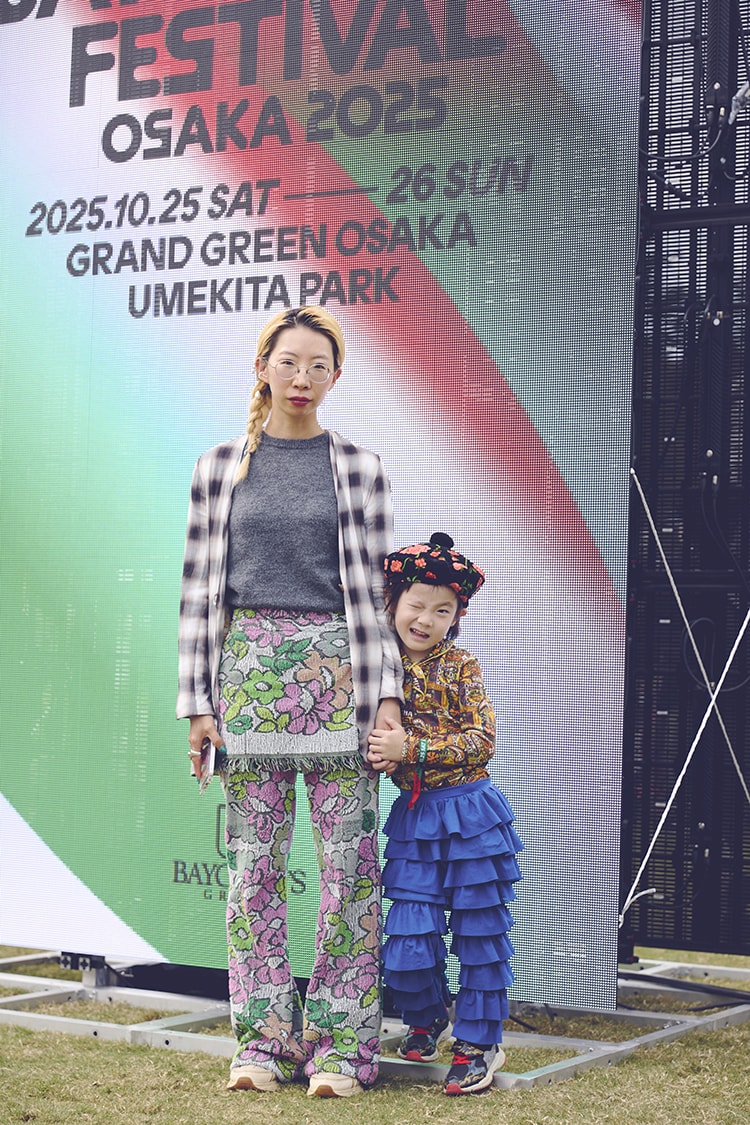 「子供も私も総柄のアイテムを組み合わせて、フェスで目立てるとにかく派手! なスタイリングにしてみました。特に気に入っているのは、子供のフリフリパンツ!」