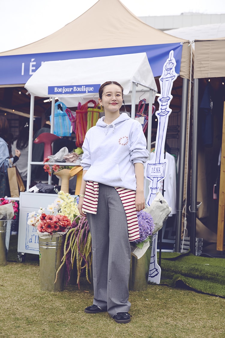 「全身グレートーンでまとめて、統一感を出しました。ボーダーのトップスを腰に巻いて、華やかさをプラスしたのがポイント。今日はスタッフみんなでボーダーのアイテムを身につけていたんです」。