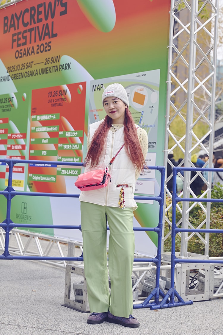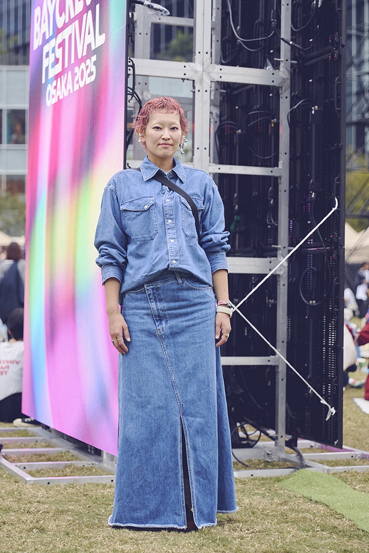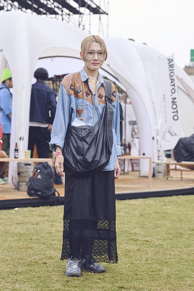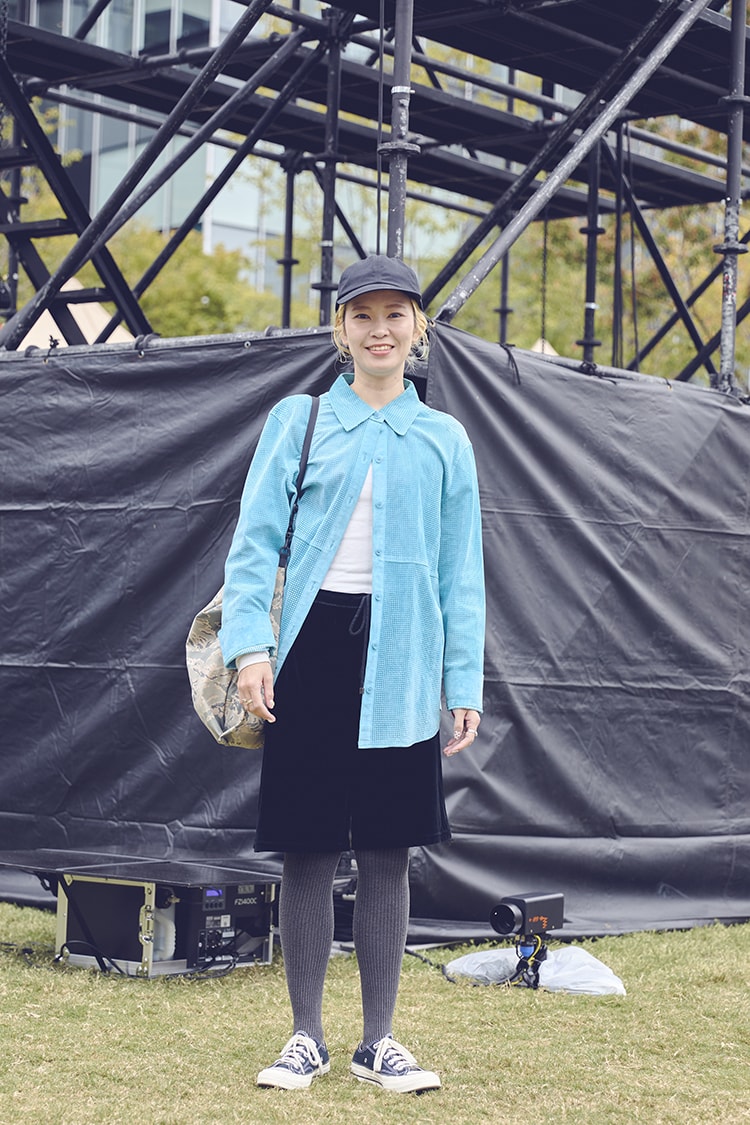 「とにかくフェスの食べ物に目がないので、フードを楽しみにして来ました(笑)。スタイリングのポイントはシャツ。メンズっぽい大きめのサイズ感が気に入ってます」。