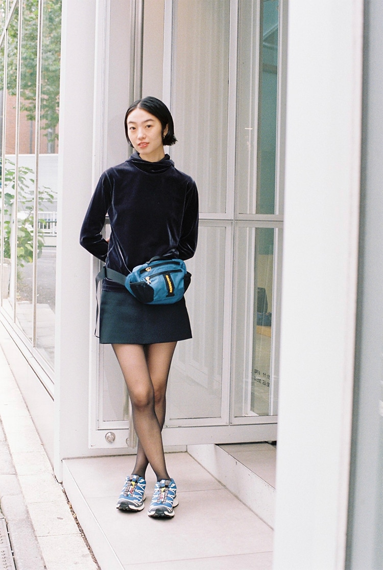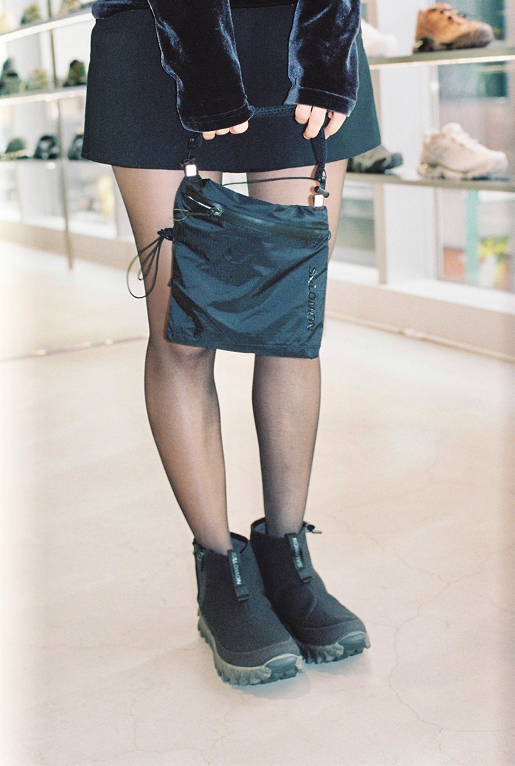 Salomonの定番にして、ストリートでも絶大な人気を誇るアイコンモデル「XT-6」。寒色好きの茉穂ちゃんが真っ先に手に取ったのは、淡いブルーにグレーを混ぜたこちら。同色のウエストパックを合わせてみました!