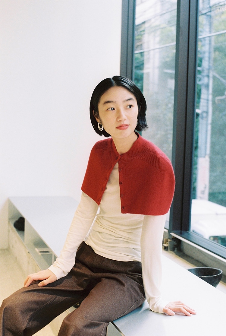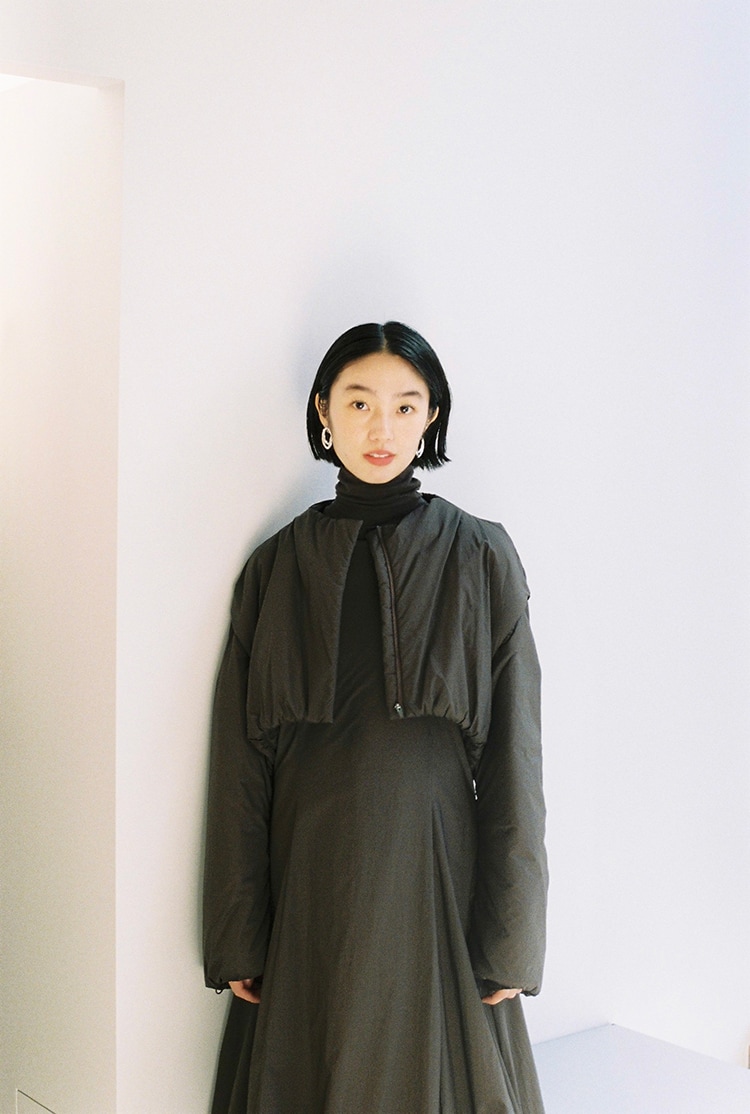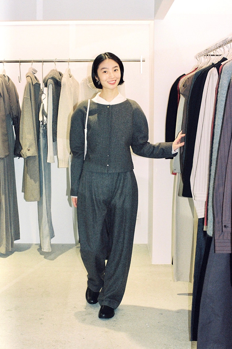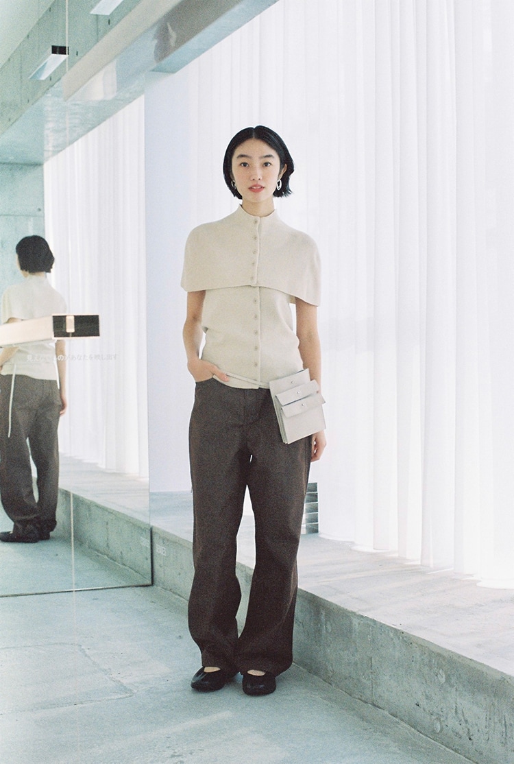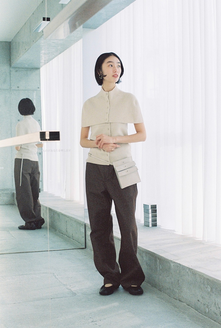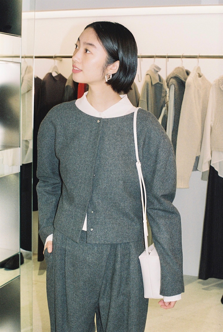 お次は、丸みのある肩のラインが印象的なショートジャケット。ウールのラップパンツと合わせて、セットアップのようなまとまりに。短丈ながら立体的なパターンのおかげで、上半身のバランスもとりやすい一着です。