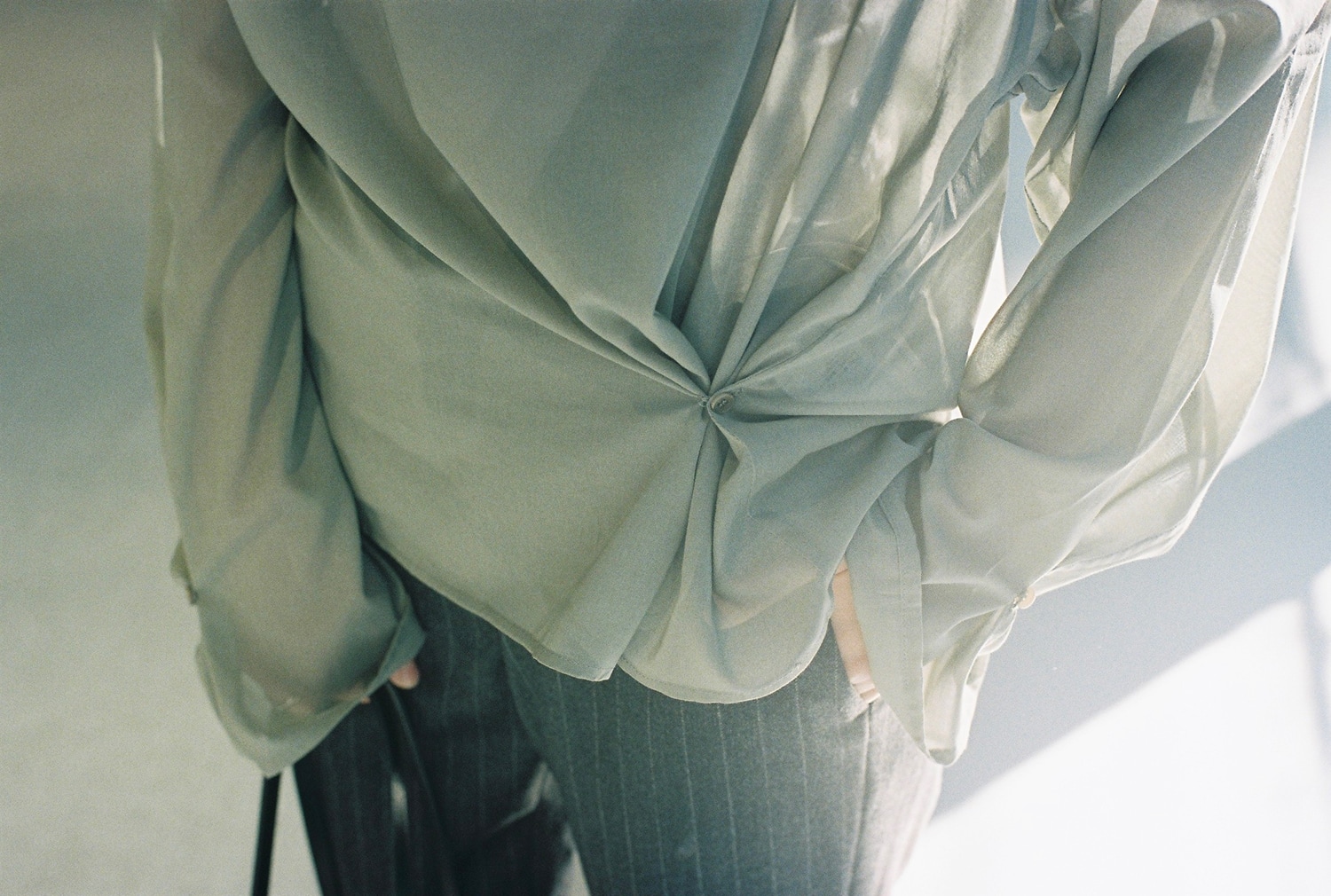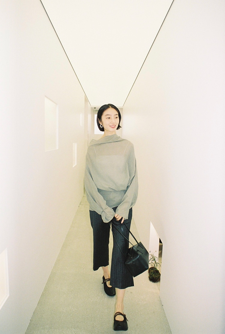 ほんのり透けるシアー素材で、中に合わせるインナー次第でムードも自由に。茉穂ちゃんはストライプのカプリ丈パンツに、VIBRAMソールのフラットシューズを合わせて軽やかに着こなしました。