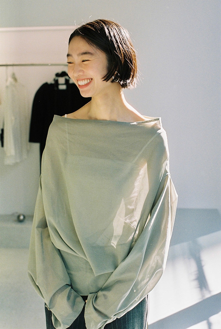 モックネックのブラウスは、ネック、袖、脇に配したボタンでシルエットを変えられるのがポイント。