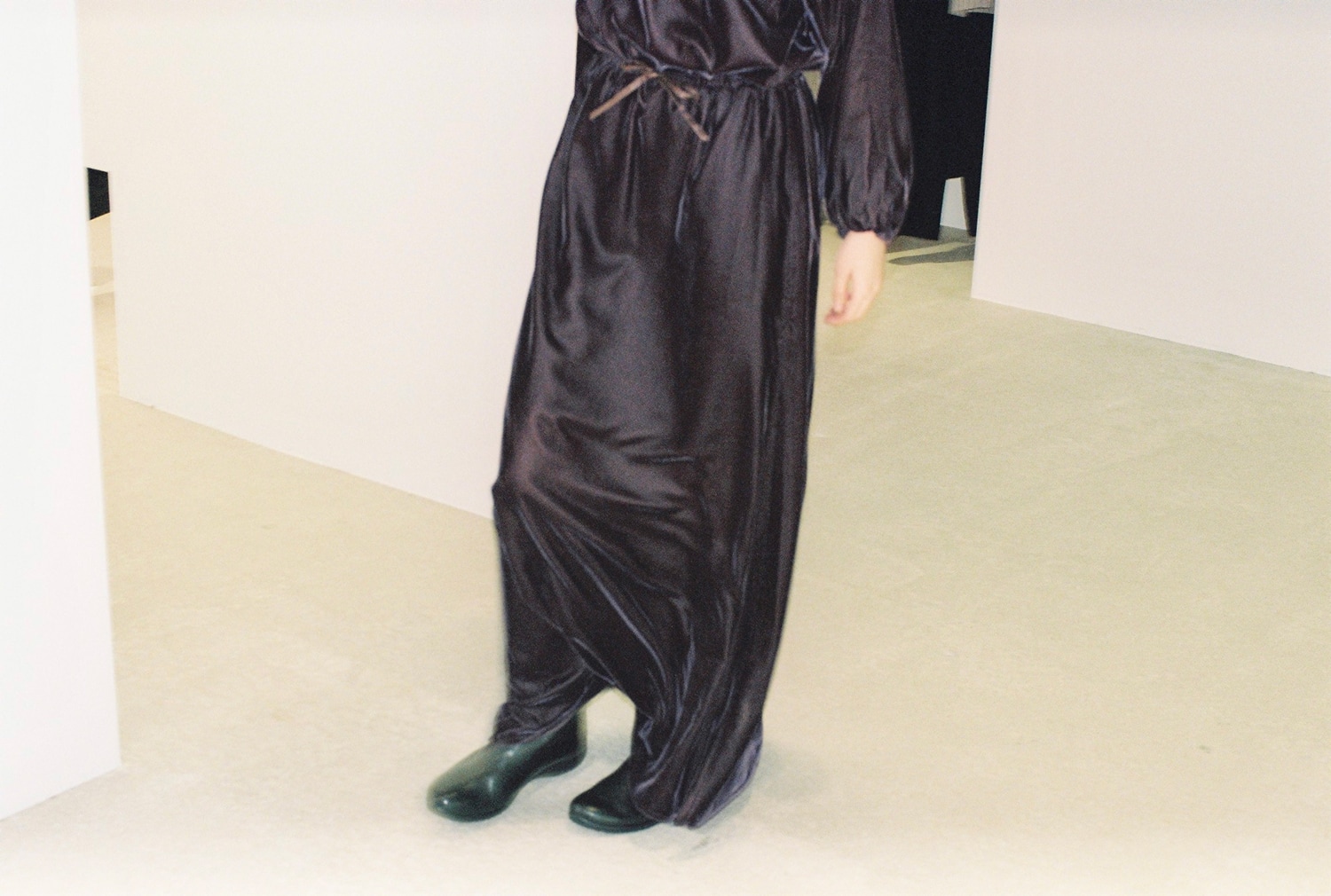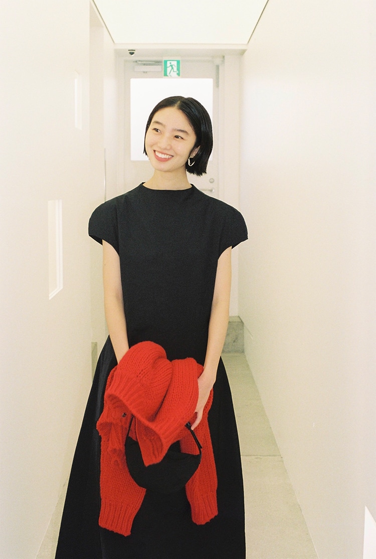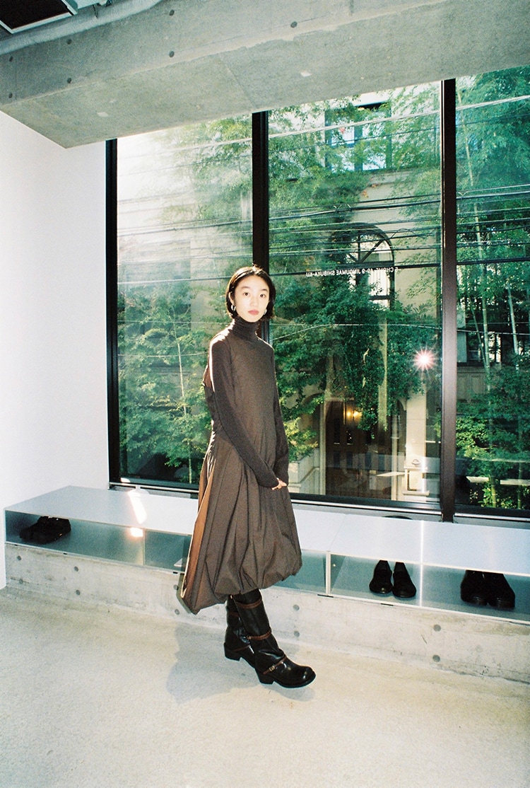 レースアップのスニーカーを合わせてドレスの甘さを中和させて、〈AMOMENTO〉らしいミニマルなムードに。