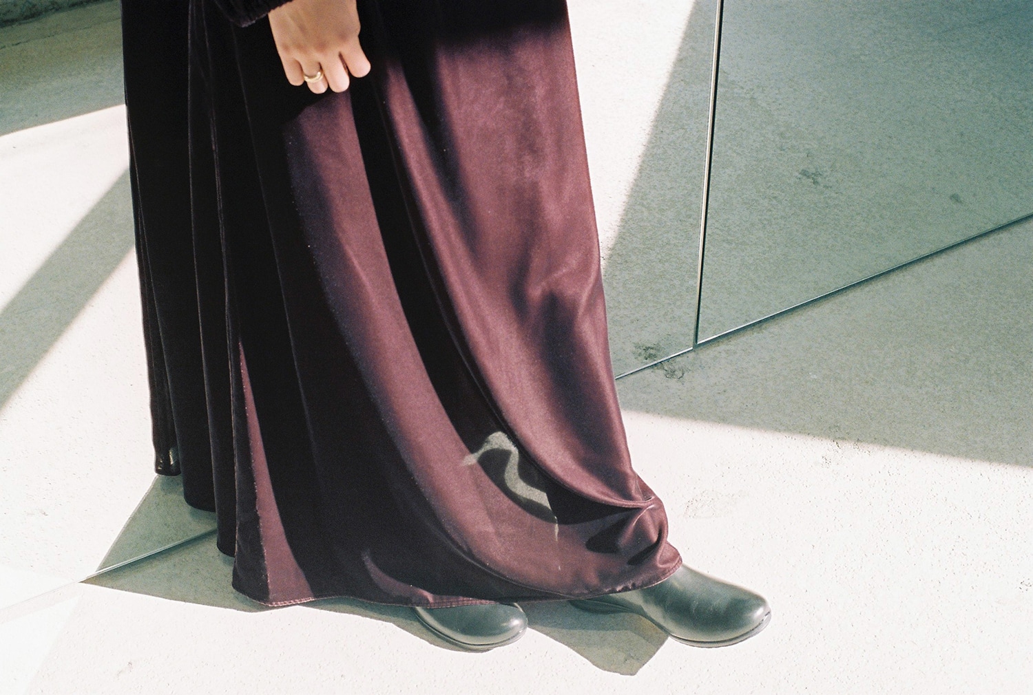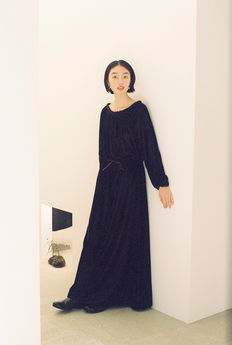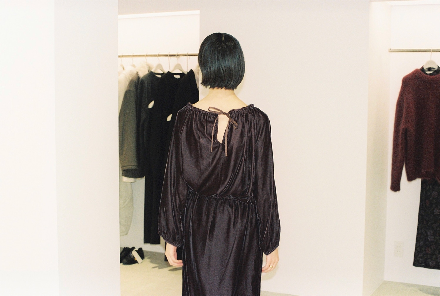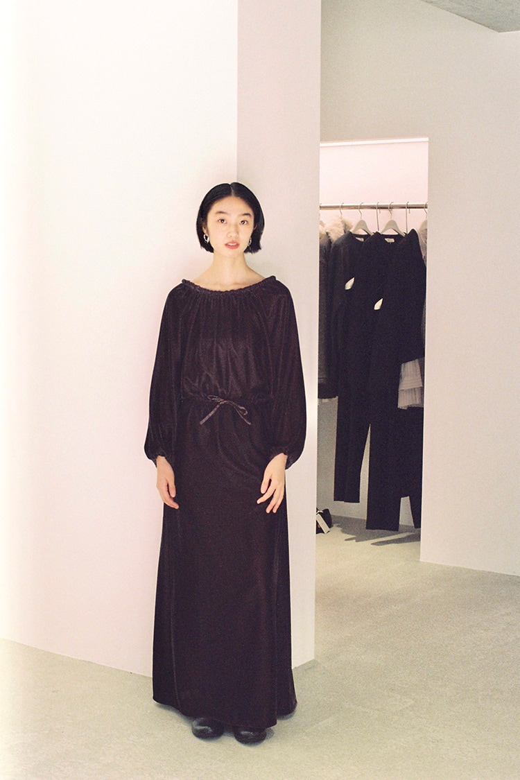 柔らかなドレープがきれいに落ちるシャーリングとベルベット素材で、光に当たるとほんのり紫がかるニュアンスカラー。トップスは後ろのストラップでオフショルダーにもできて、1枚でぐっと雰囲気が出ます。
