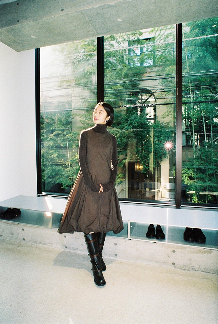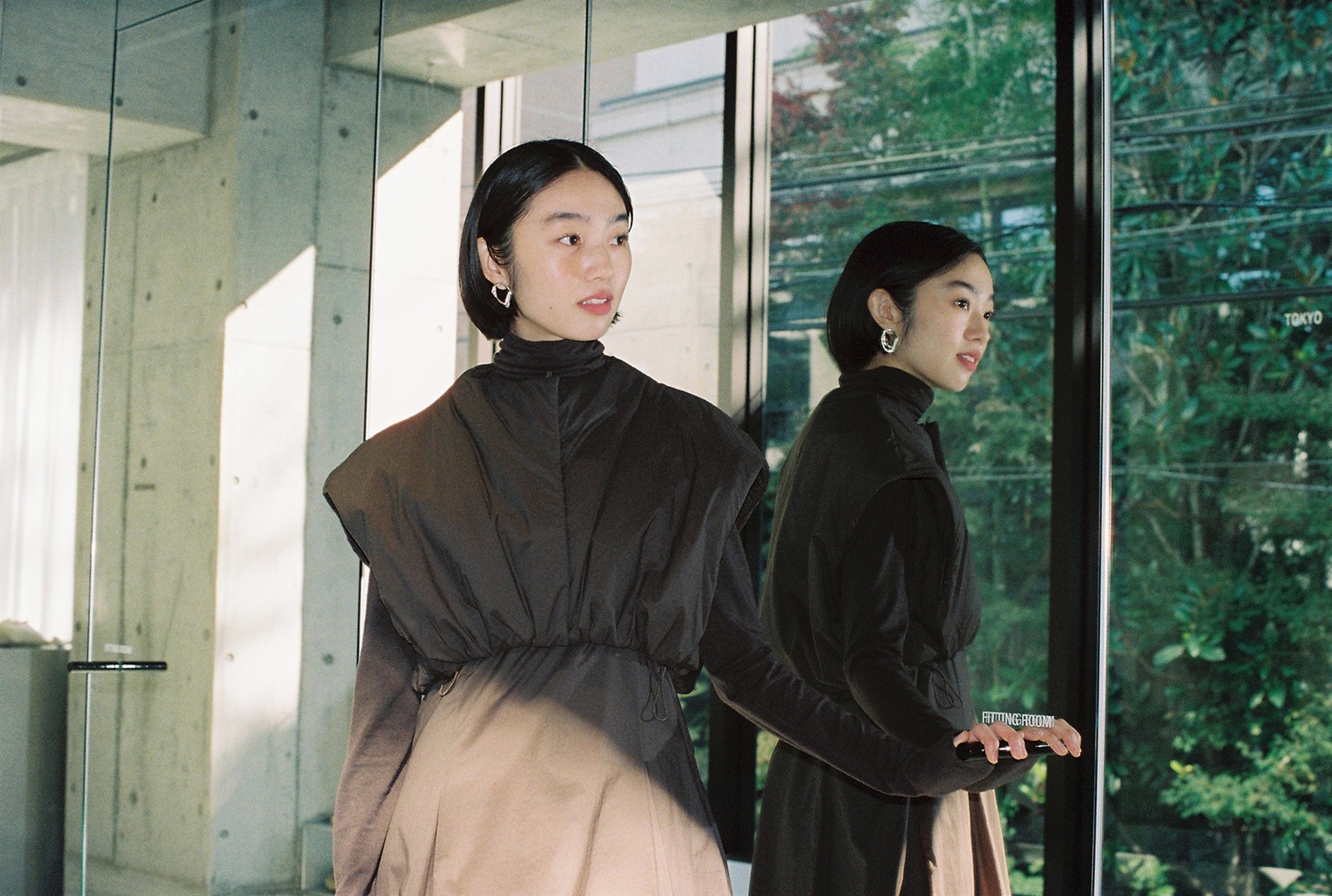 続いて、シアーなミニドレスに同素材のクロップドジャケットを重ねたブラウンのルック。ドレス単体でも立体感がきれいに出るけれど、ジャケットを重ねるとより構築的なシルエットに。袖は取り外してベストにもできるから、外は寒いし電車は暑いし……という温度調整が難しいこの時期でも頼れる実用派セットです。