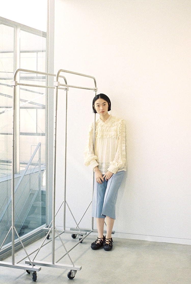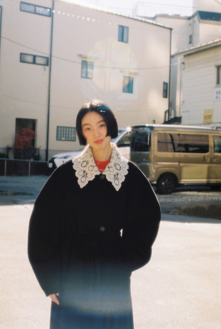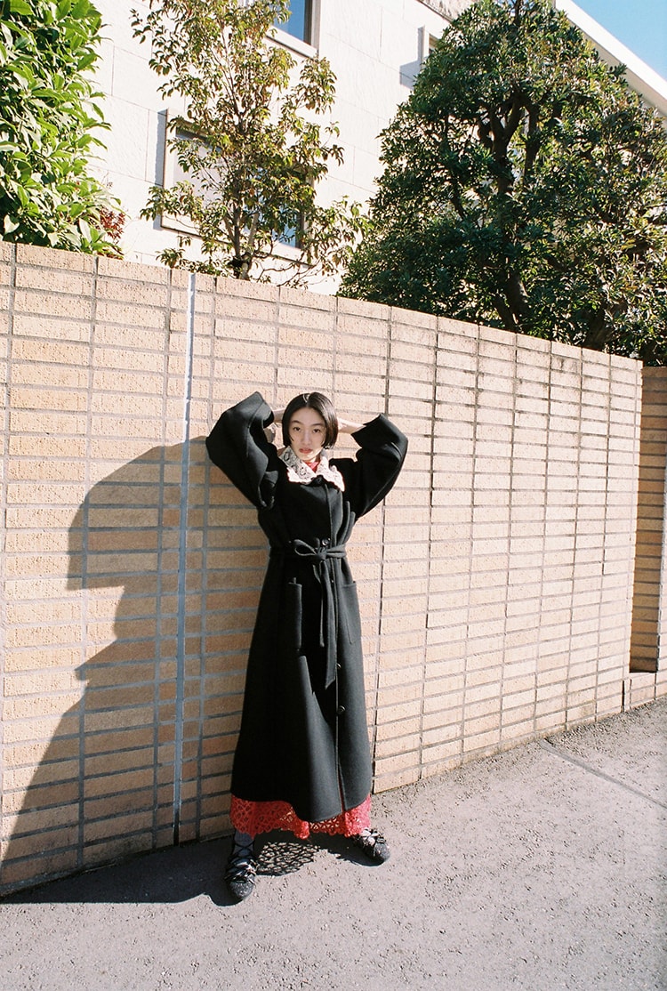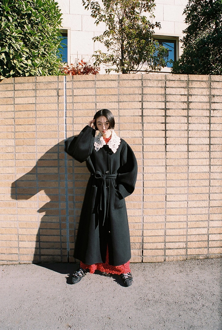 最後は、上質なウールを使用したエリソンコートを主役に。刺繍レースの襟がアクセントになっていて、どこかヴィンテージを思わせる佇まいです。