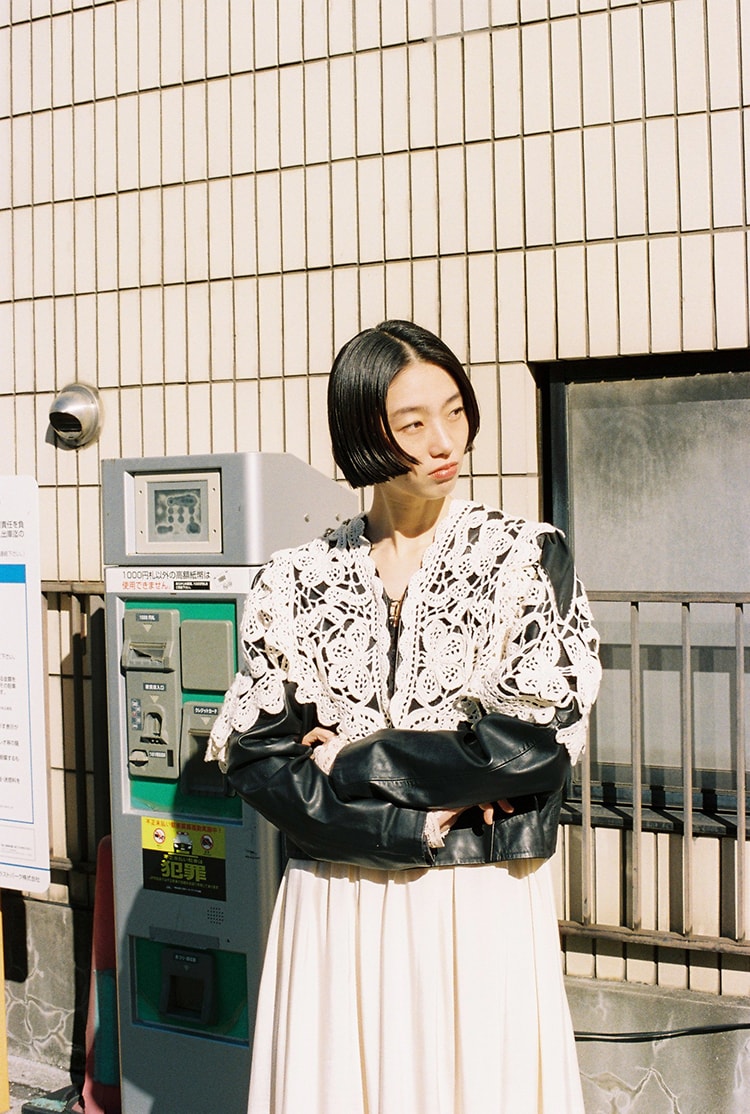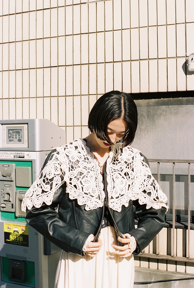 クロップド丈のレザージャケットは、びっしりと施された繊細な手編みのディテールが印象的。ぐっとクラフト感のある表情で、コンパクトなサイズ感ながら、ボリュームのあるワンピースにも、きれいなラインのボトムにも合わせやすい!