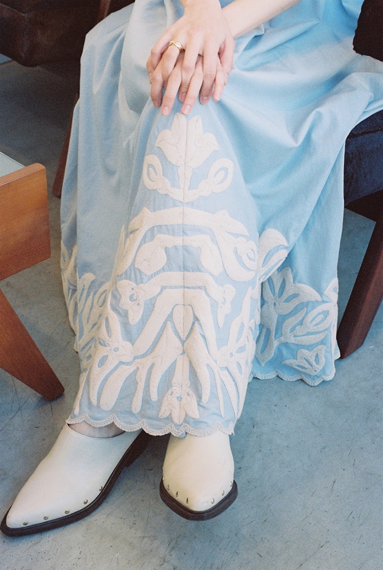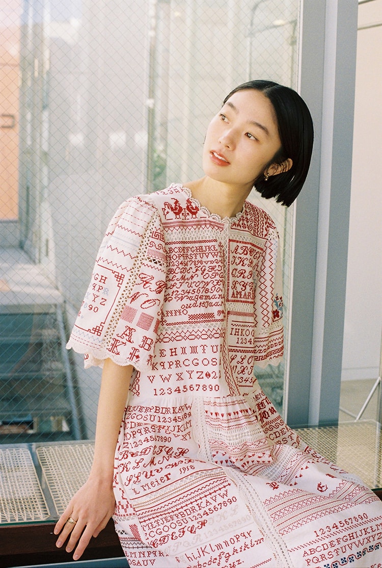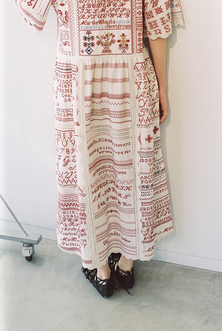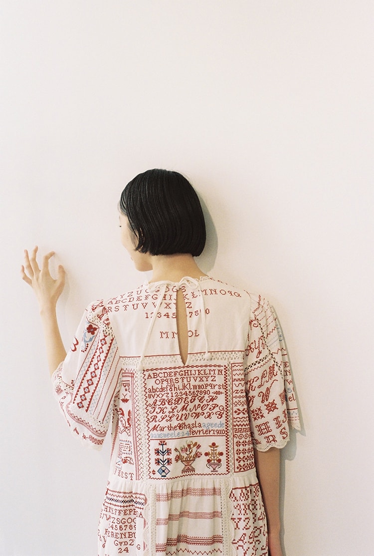 〈Sea New York〉といえば外せないのが、今季も健在な刺繍使い。春夏は、ヴィンテージの刺繍サンプラーから着想を得たステッチやモチーフを、トップスやドレスに自由に散りばめたデザインが。このドレスもそのひとつで、フロントからバックまで刺繍がたっぷり!