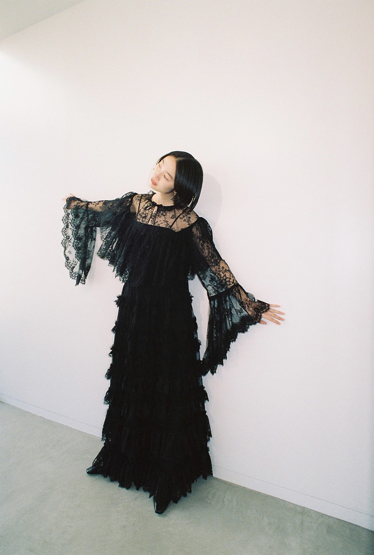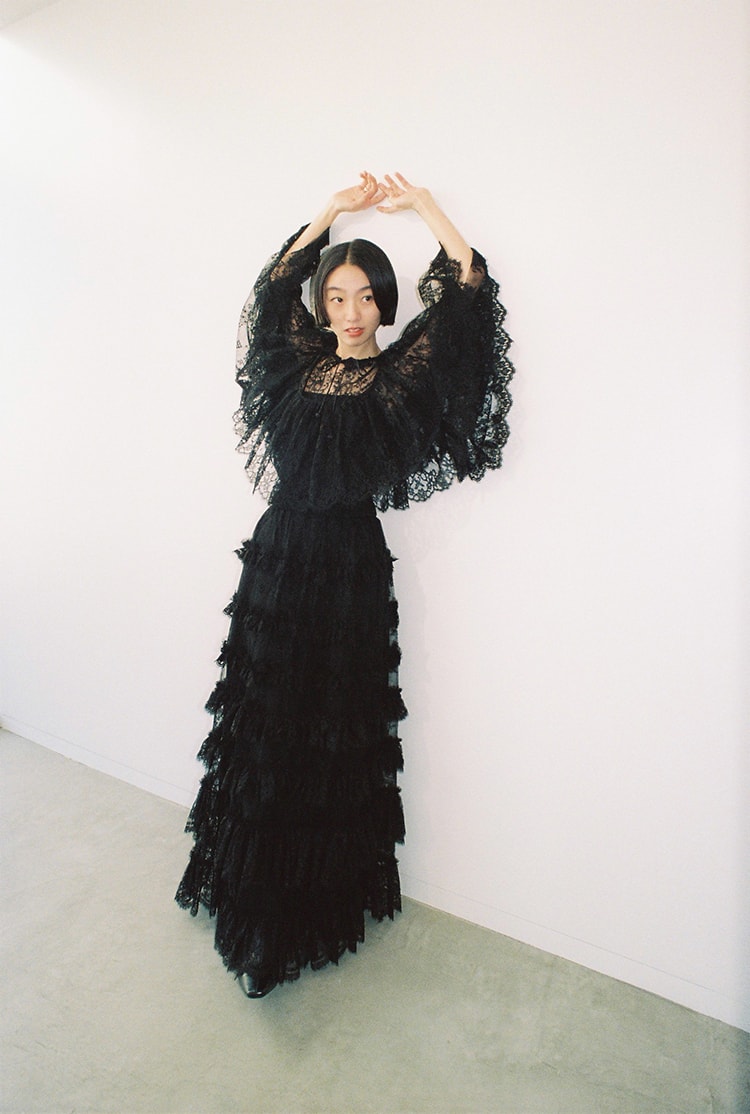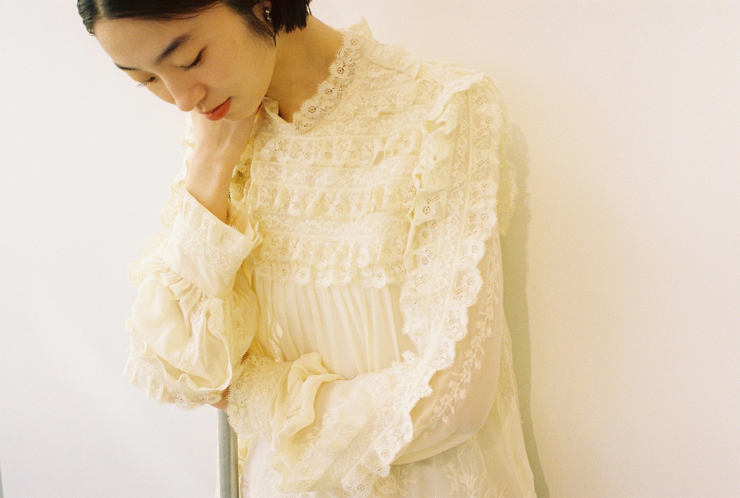 夜はやっぱり、ドレッシーに。繊細なレースをたっぷり使い、動くたびに表情が変わってドラマチック。フリルや袖のボリュームがレイヤードされて、自然と視線を引き寄せます。