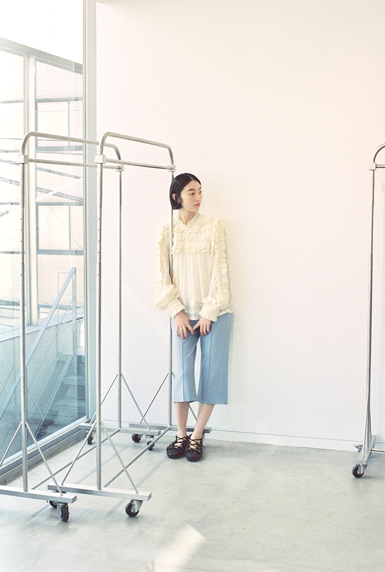 ハイローヘムのフレアシルエットが印象的なブラウスは、動くたびに空気をはらんで、自然と存在感が出る一枚。茉穂ちゃんの動きに合わせて、躍動感もしっかり。