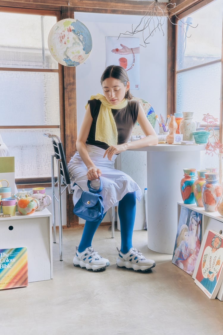 「スタイリングのポイントはカラーリングです。ブルーやイエローのストールで軽やかさを出しつつ、ブラウンのトップスで全体を引き締めています。シューズが淡いグレーなので、ブルーのタイツとのコントラストで足元が自然とポイントになるようにしました。機能性とデザインのバランスがよく、普段のスタイリングにも取り入れやすそう。