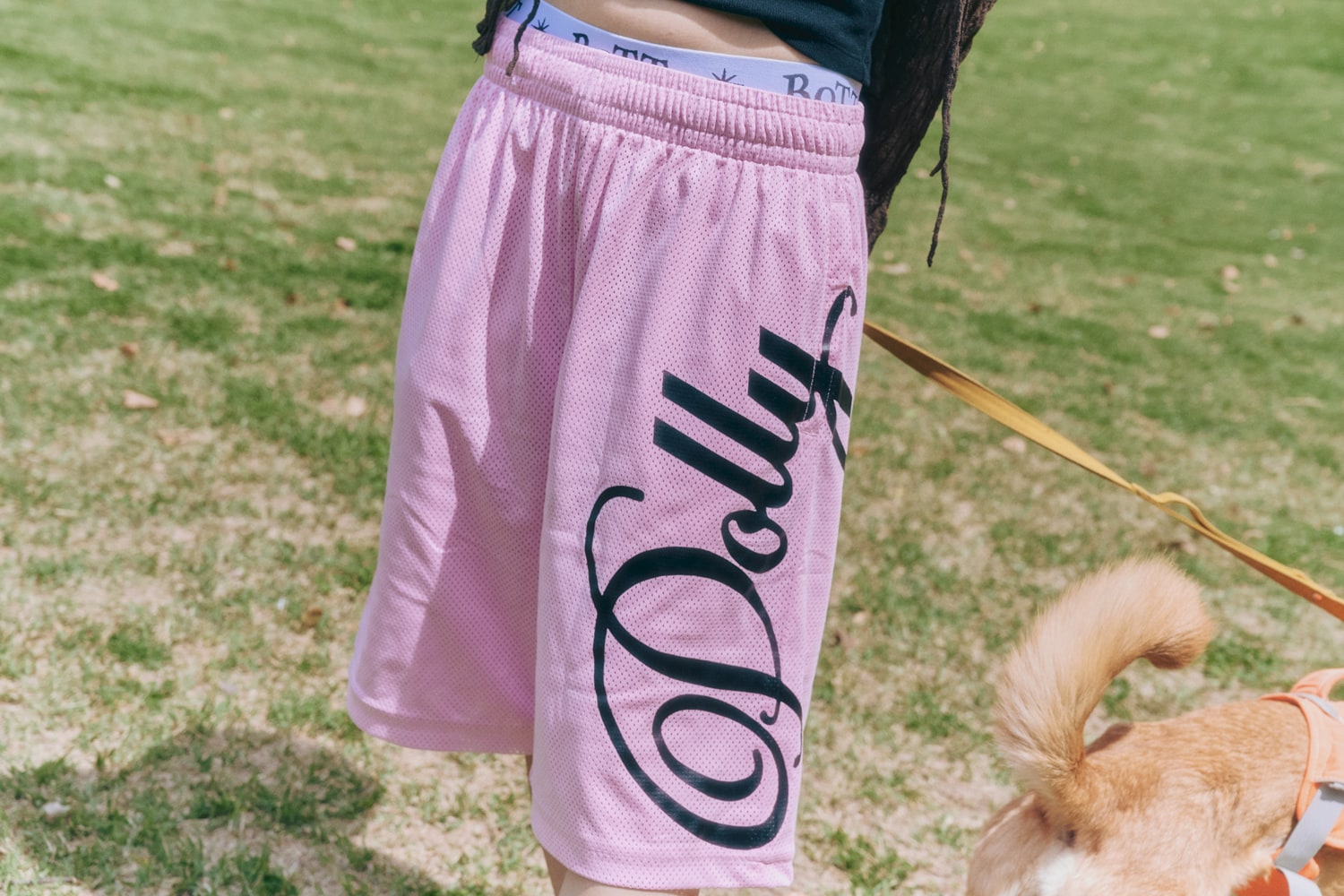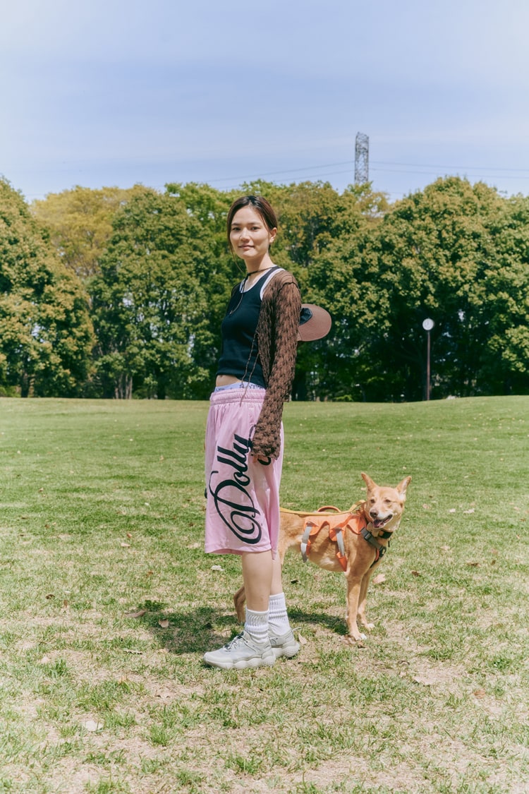 「初夏がテーマなのとシューズに目線がいくように、暖かくなるといつも履いているラフなショーツをメインに。タンクトップ合わせやヘソ出しで、アクティブなムードをイメージしました。シューズはメッシュ素材で通気性もよく、夏に最適! 普段から愛犬と一緒に公園を散歩するのですが、思い切り走っても疲れにくいです。」