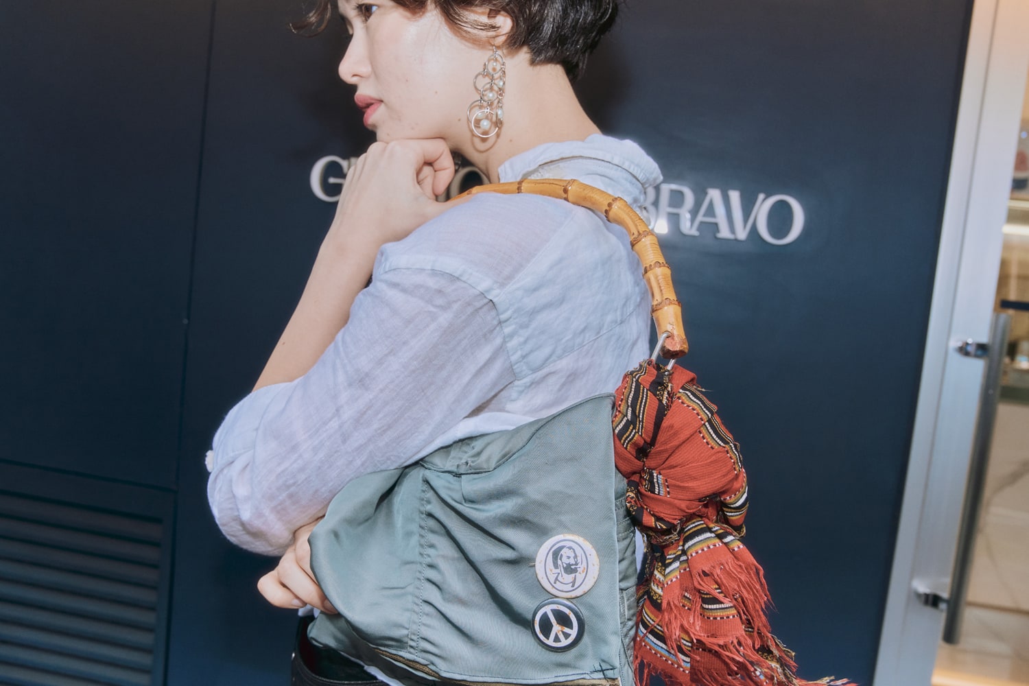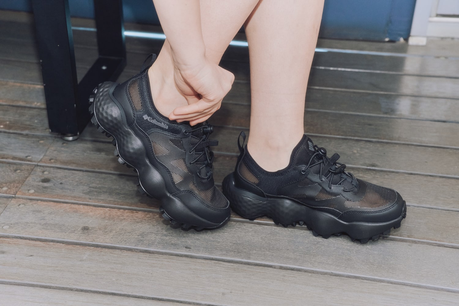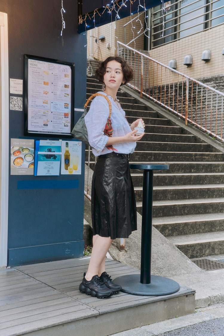 「アウトドアムード満載なので、バランスを取るためにシティライクなスタイリングにしてみました。このシューズはくるぶしが見えてこそかわいくなると思ったので、あえて足元は裸足にローファーのイメージ。ごつごつとしたソールとすっきりしたアッパーのギャップが好きです!」