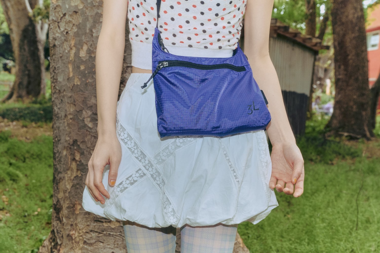 「白をベースにカラフルな色を織り交ぜて、爽やかさとワクワクする夏の雰囲気を意識しました。足元はファンシーなチェック柄のタイツにソックスを合わせてアレンジ。シャンダルは見た目もスポーティだし、スピードレースが便利でかわいい。ソールの安定感もあって歩きやすかったので、いつもの公園で過ごすのにぴったり。」