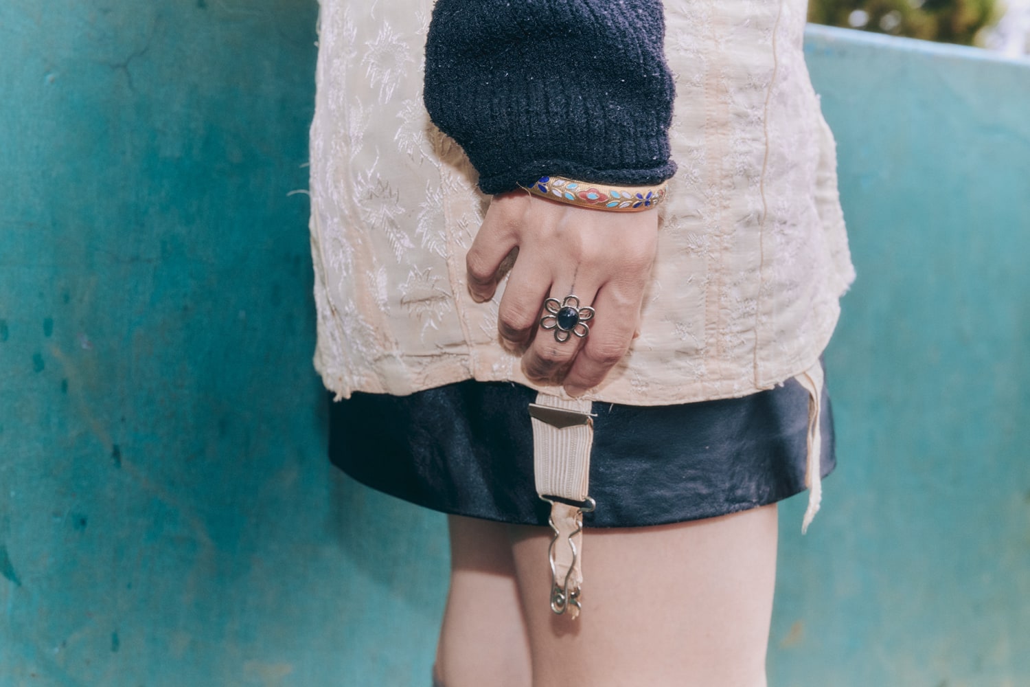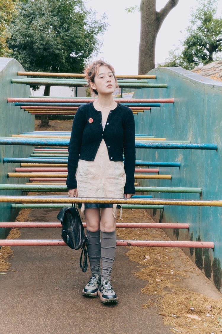「うねうねしたソールと爬虫類みたいなカラーリングがすごく個性的でかわいいなと思いました。甘さとスポーティさのコントラストを楽しみたかったので、レースや昔の下着(100年前くらいのものです……!)を取り入れてバレエコアなムードに。ニーハイをくしゅっとさせて、足元にたるませたのもポイントです。」