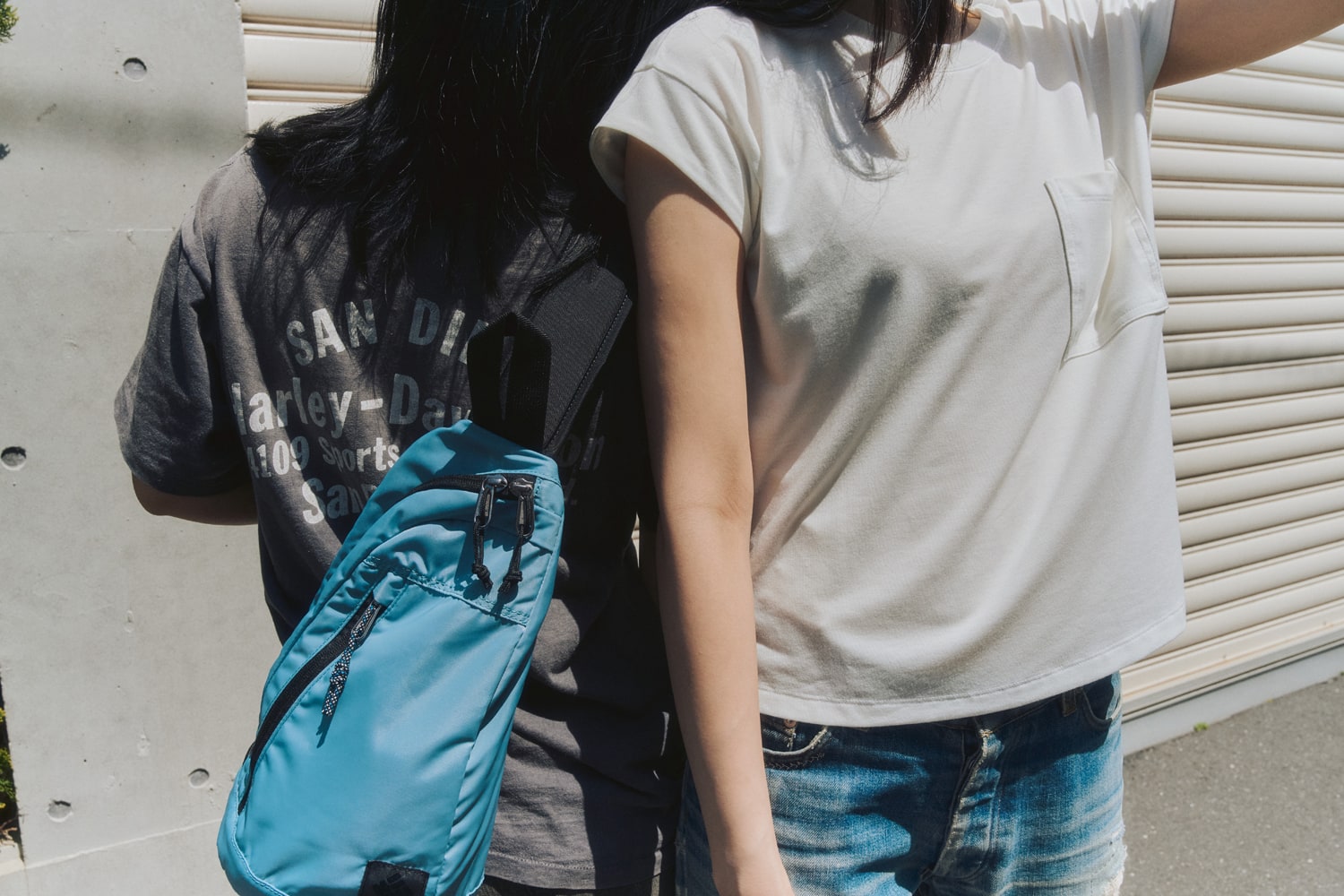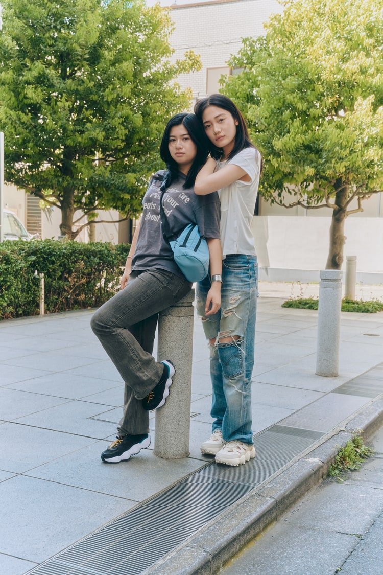 「スポーティなシューズに、ブーツカットのデニムを合わせて少しバランスを取りました。全体をモノトーンで統一してバッグで色をプラス。水陸両用なので、靴下なしでも履けるのがお気に入りです!」(ゆきは) 「夏なので、さらっとしたTシャツにデニムを合わせてSimple is the bestな組み合わせに。Tシャツとシューズの色を合わせてみました! ゆきはとは幼馴染でよく遊ぶのですが、2人でこのシューズで川に行きたいです」(Niko)