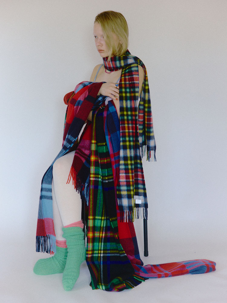 〈Joshua Ellis〉首に巻いたストール ¥39,600、手に持ったストール