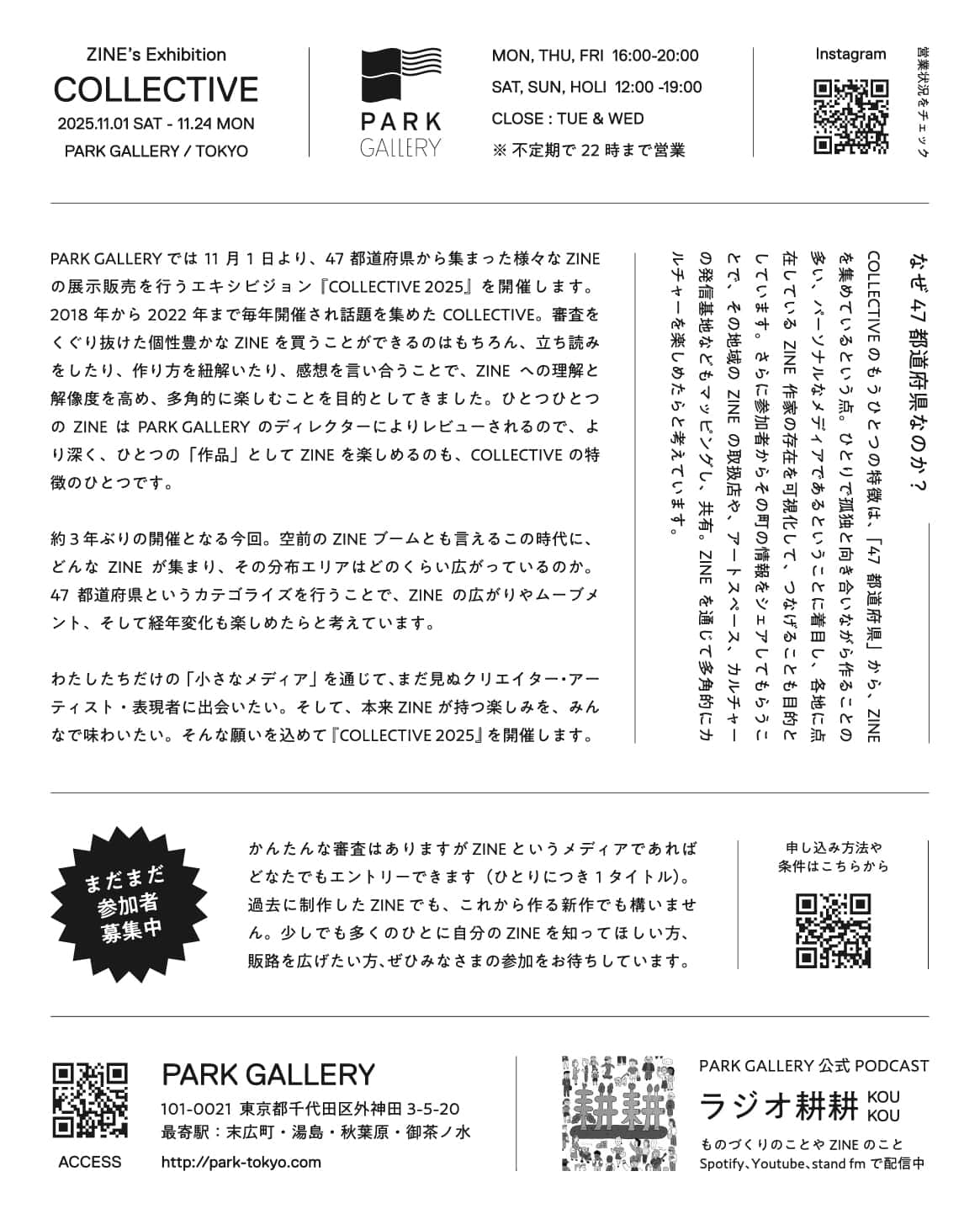 御茶ノ水の「PARK GALLERY」にて、約3年ぶりとなるZINEの展示販売イベント「COLLECTIVE 2025」が、11月1日(土)〜11月24日(月・祝)に開催されます。