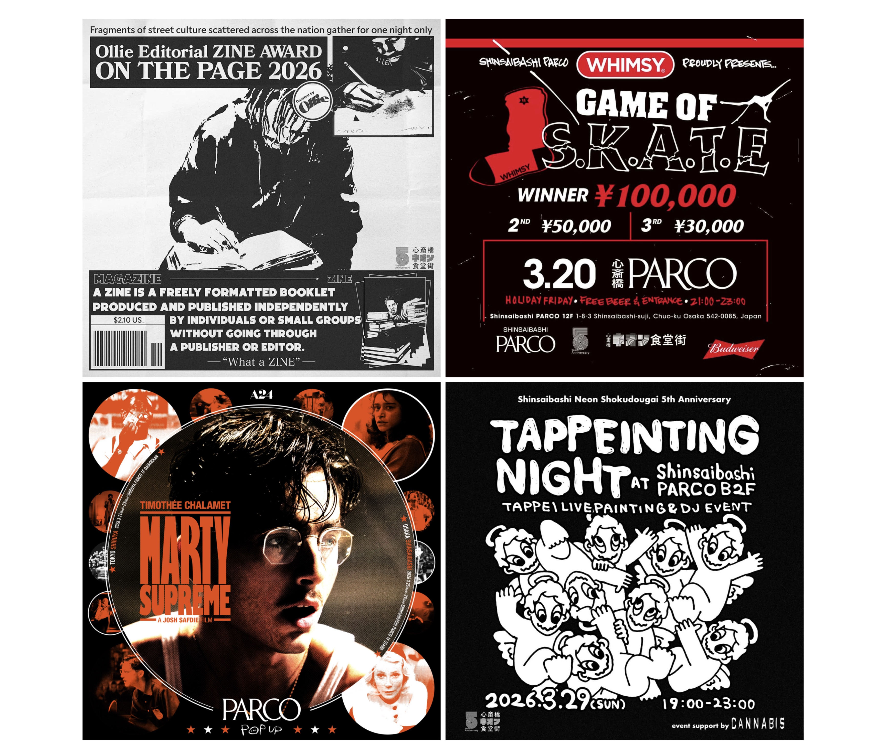 そのほかにも、ストリートカルチャーマガジン「Ollie」監修のZINEアワードでは全国のインディペンデントな表現が集まり、大阪発のソックスブランド〈WHIMSY〉とタッグを組むスケートイベントでは館内でリアルなセッションが繰り広げられる予定。「A24」の最新作にフォーカスしたポップアップや、TAPPEIによるライブペイントイベントなども控えていて、もはやフードフロアという言葉では収まらない振り幅。
