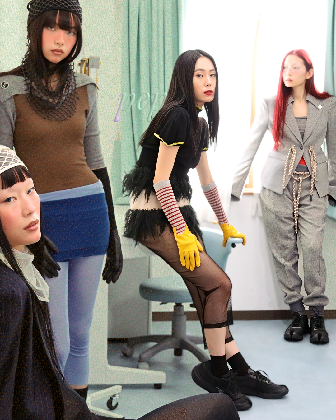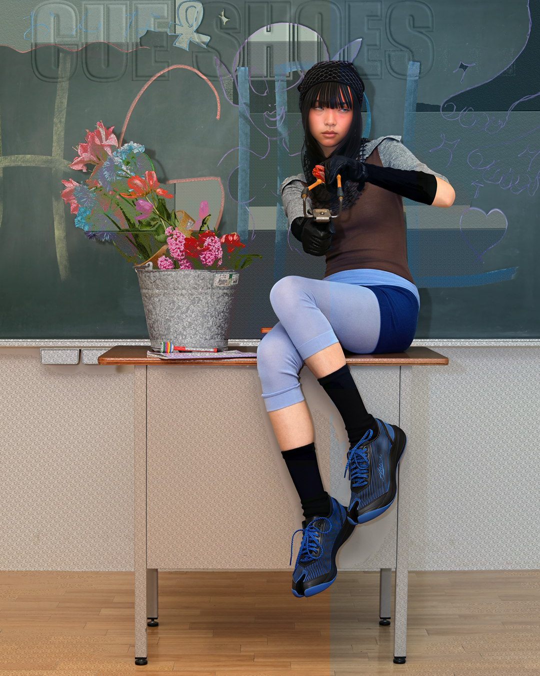 キャンペーンビジュアルにもご注目を。学校の教室のような空間に、エッジの効いたモデルたちが登場。深いブルーの「TABI」に、チュールスカートやカラフルなタイツを合わせたスタイリングも印象的です。